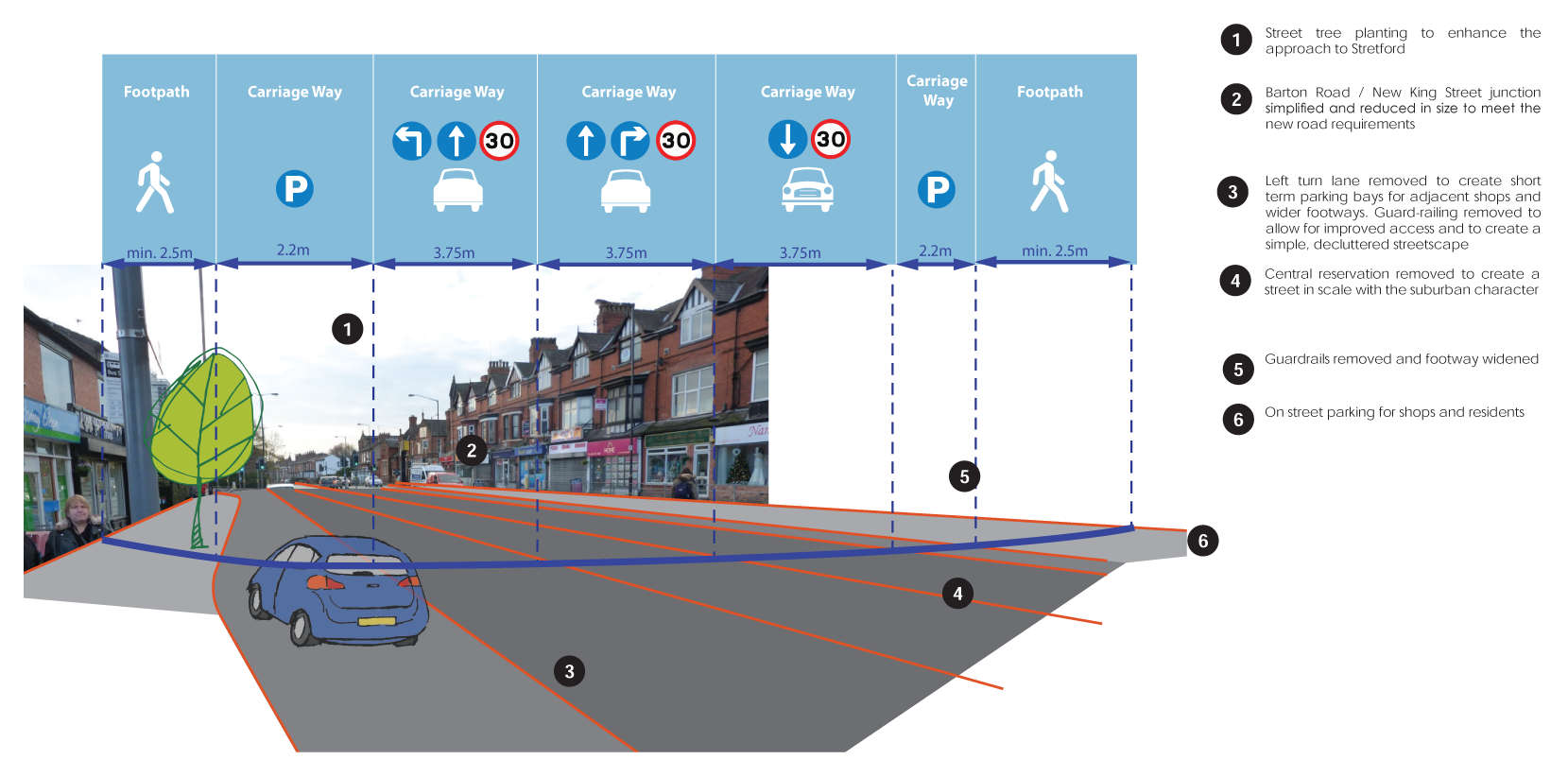 The proposals aim to improve the public realm around Stretford town centre, while reducing the impact that Chester Road, Barton Road and Kingsway have in isolating the town centre from the rest of Stretford.