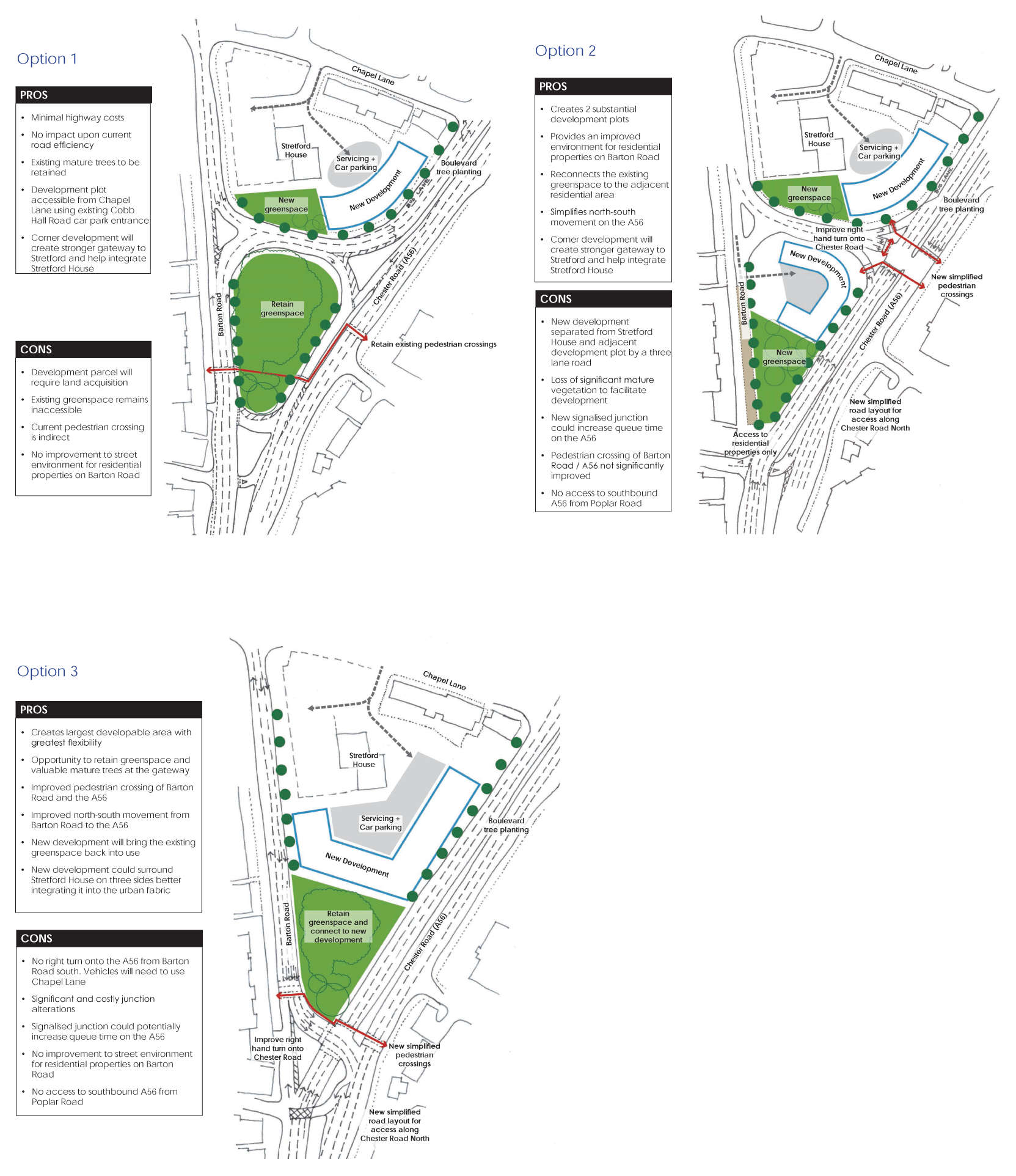 The intention is to retain the existing cycle provision along Chester Road, conscious that this north-south axis is supported by the route along the Bridgewater Way, which caters for the more leisure oriented cyclist who wishes to avoid Chester Road.