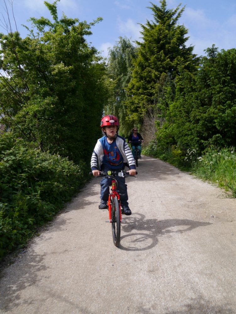 The eldest and other half riding along a gravel path The eldest and other half riding along a gravel path
