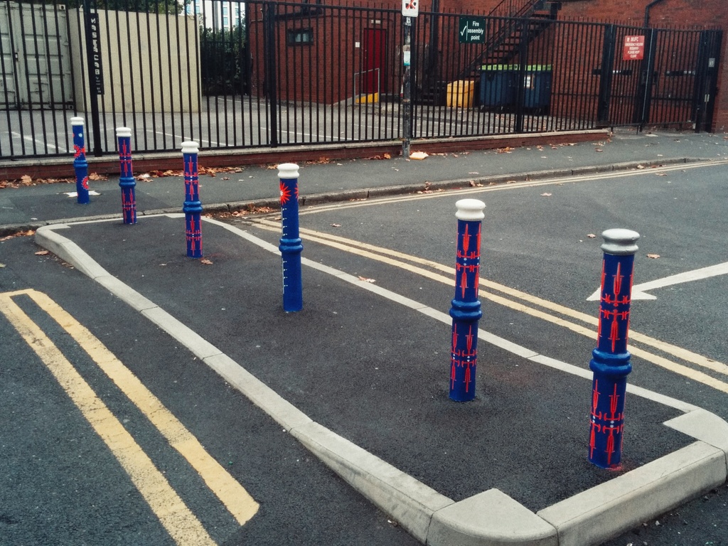 Round the corner from Old Trafford football stadium on Railway Road. There’s a little bit of filtered permeability that’s just become a little brighter, courtesy of rather wonderful Gorgeous Gorse Hill and local artist Caroline Daly. As you can see below, the bollards feature bikes and bike components, in-line with their purpose.