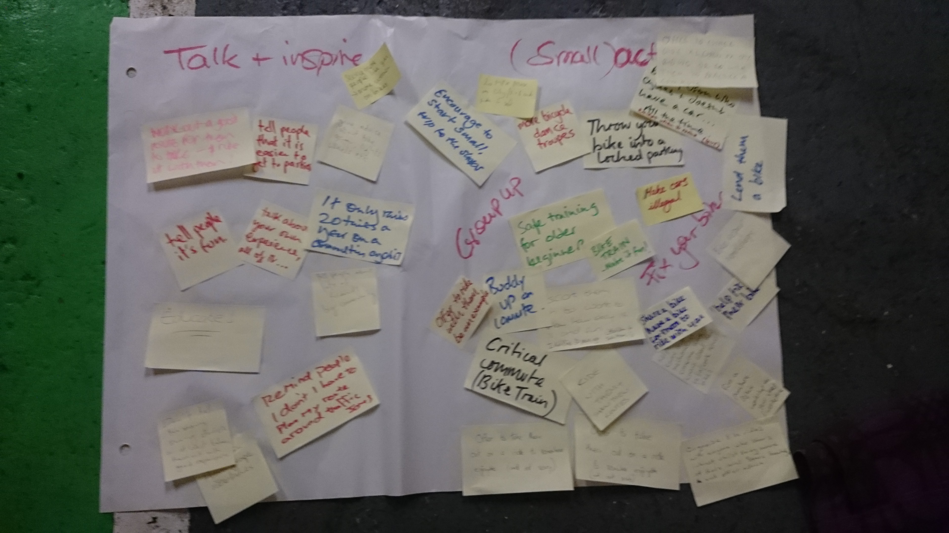 After some time, each group presented a summary of ideas to everyone. With ideas ranging from ways of improving bike parking in apartment blocks, to ditching the Lycra, wearing your normal clothes and going a bit slower.