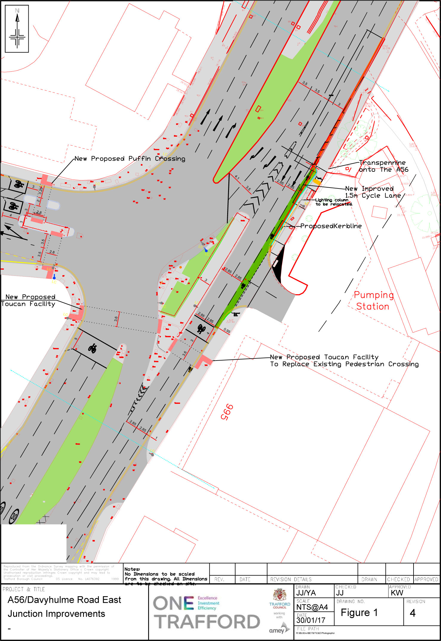 The proposals include upgrades of the A56 crossing just south of Davyhulme Road East from pelicans to toucans, enabling bikes to cross here legally. They also include an upgrade to the Davyhulme Road East crossing to a two stage staggered puffin crossing and a reduction in traffic lanes onto the A56.