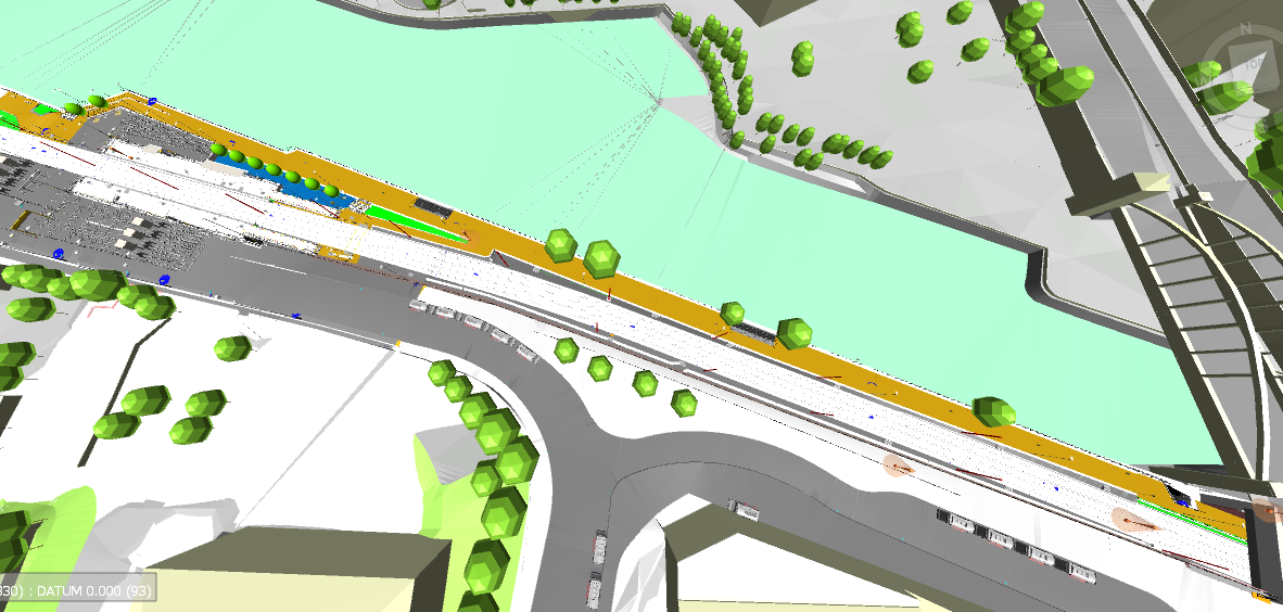 This image shows the point where the tramway does move into the existing waterfront area, however, it traverses along the southern section only. The existing ramp is increased in length and width, this is to permit the tramway to remain at one level as well as maintain pedestrian access in this area. The section of the image in light grey and blue will not be affected.