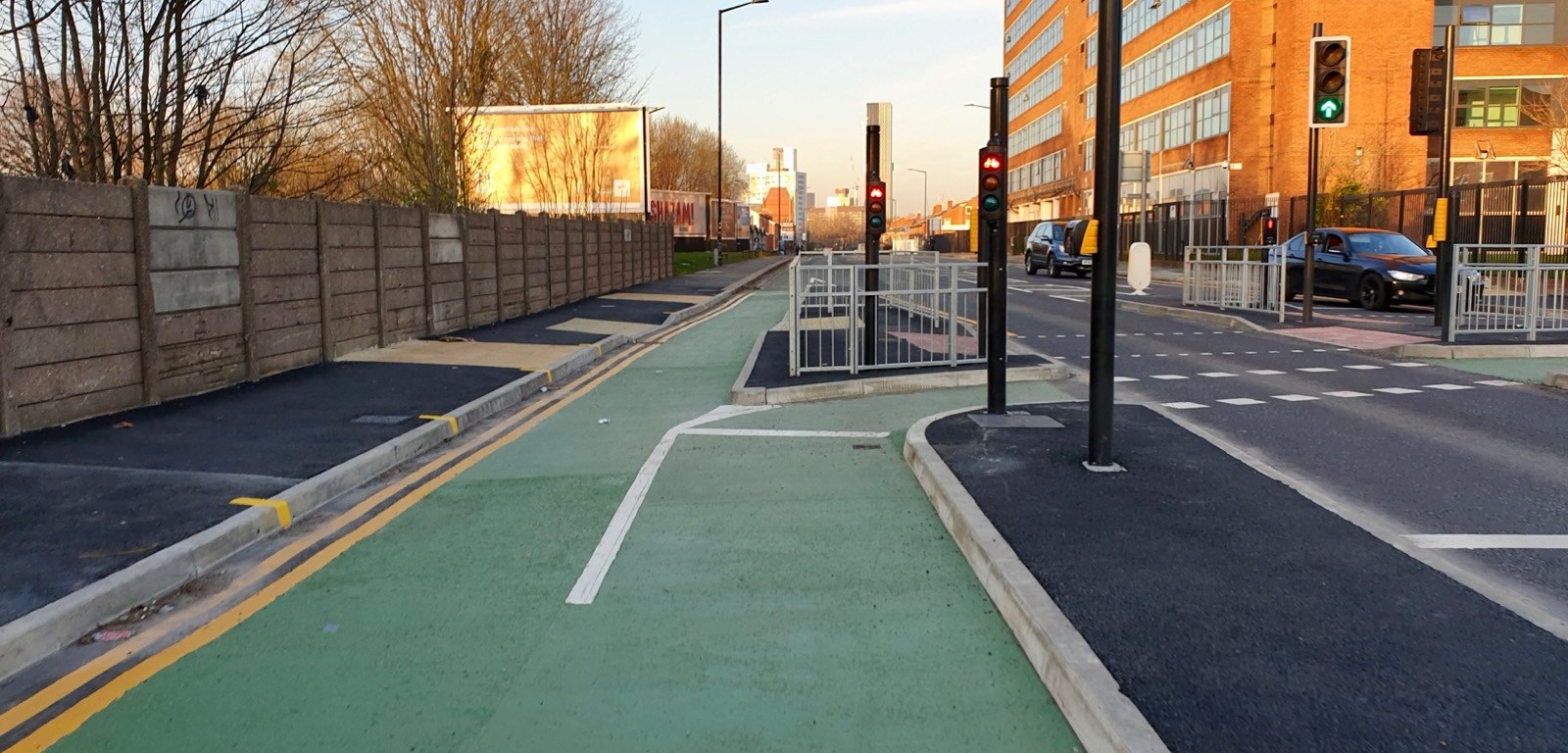 As you approach Stretford Road, the cycleway widens with a right turn lane. At the right turn, there’s a new set of cycle traffic lights, which are triggered by a button.