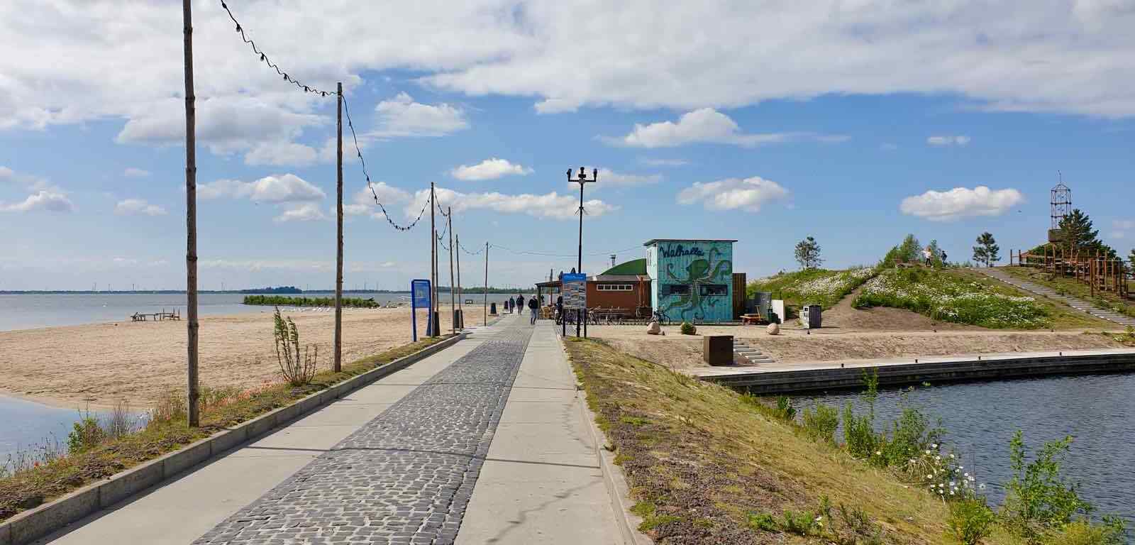We headed out through the city walls and towards Stadsstrand Harderwijk, the beach island in the Wolderwijd lake. On the way there, we passed a large cycle parking area, which was quiet when we arrived, but you can imagine gets pretty busy at the weekend.