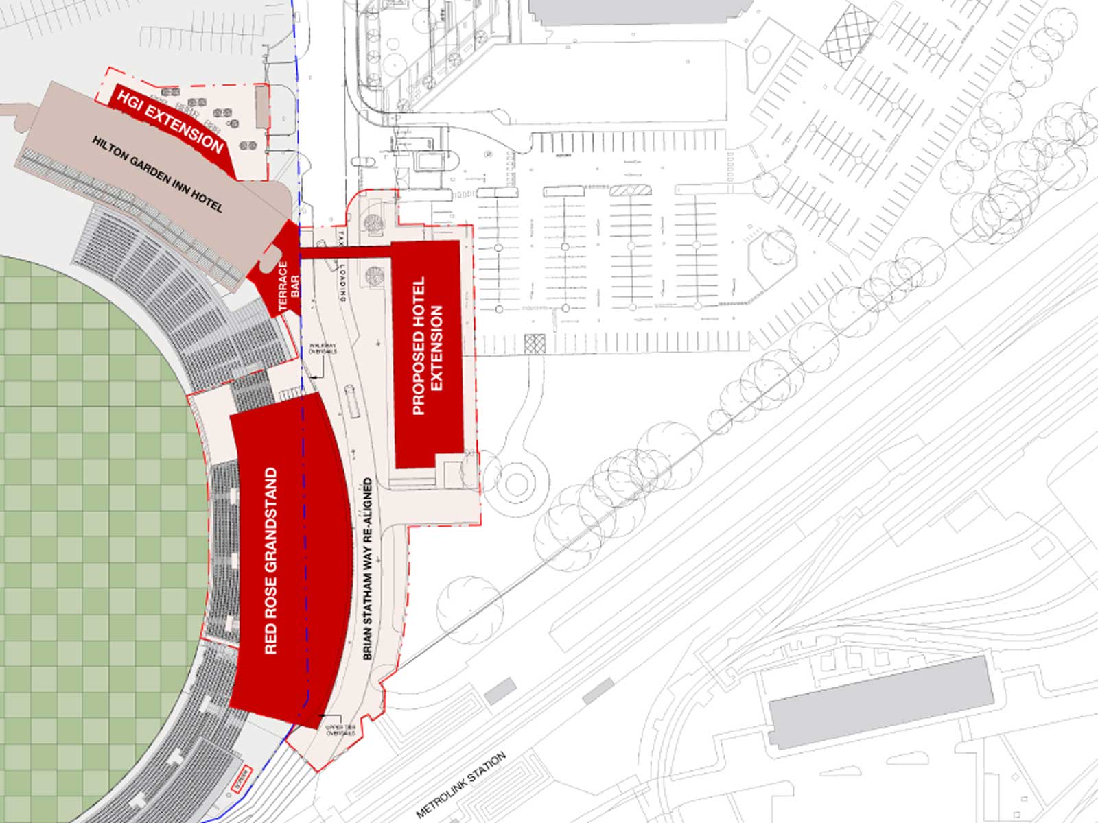 The proposed extension to the Hilton Garden Inn and pedestrian bridge across Brian Statham Way from the LCCC stadium isn’t mentioned in the masterplan. Though it can be found in the planning application 99105/FUL/19, submitted last month and corresponds with one of the mansion blocks in the masterplan.