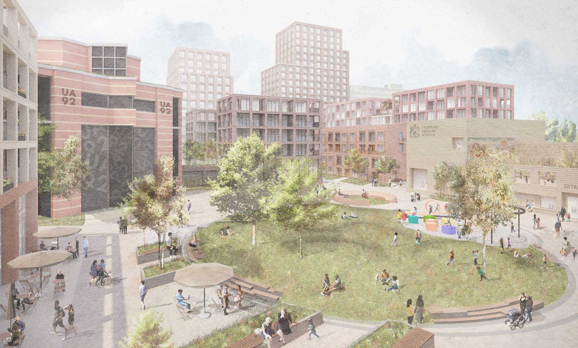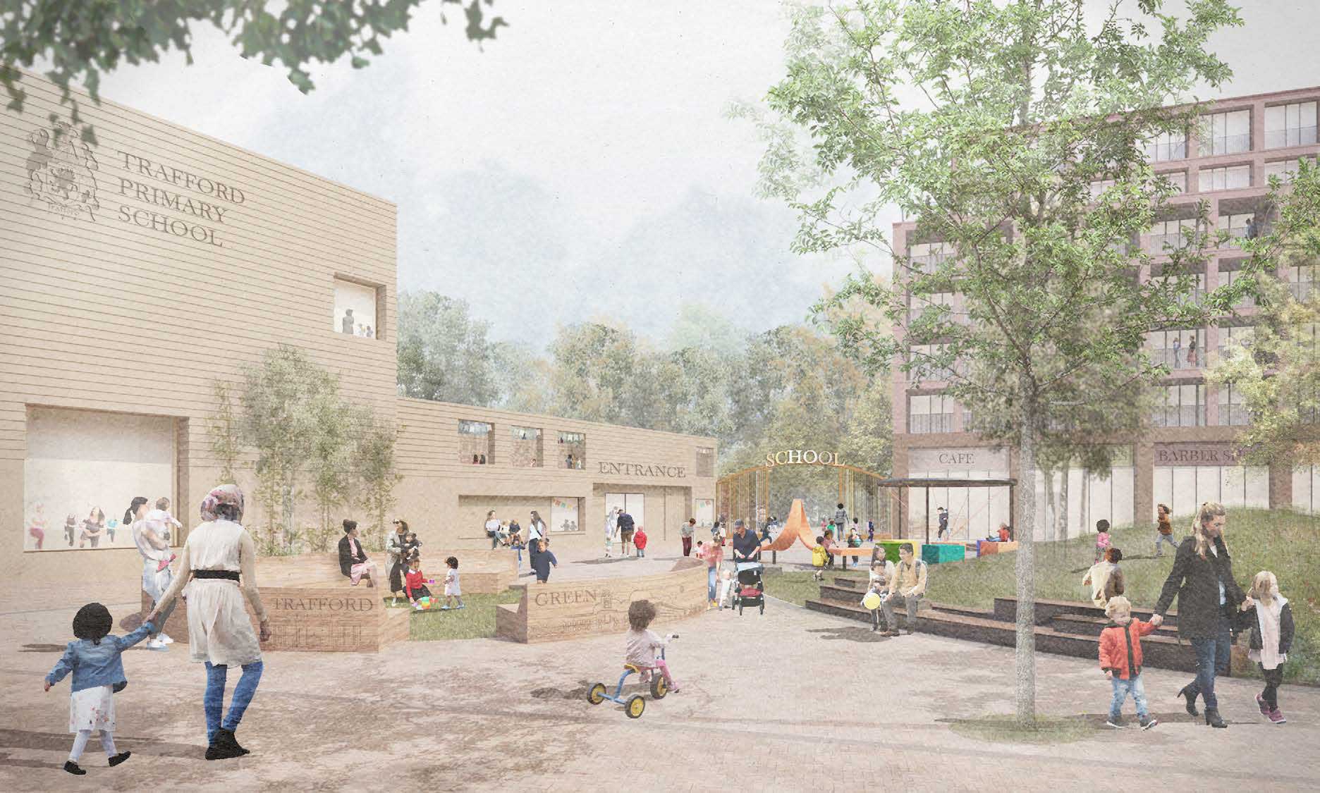 The vision section goes on to reiterate the points around creating a neighbourhood for Trafford, the community and to live in, through the creation of the square, school, open spaces and safe pedestrianised streets. In my view, the proposals in the masterplan do deliver on these aims.