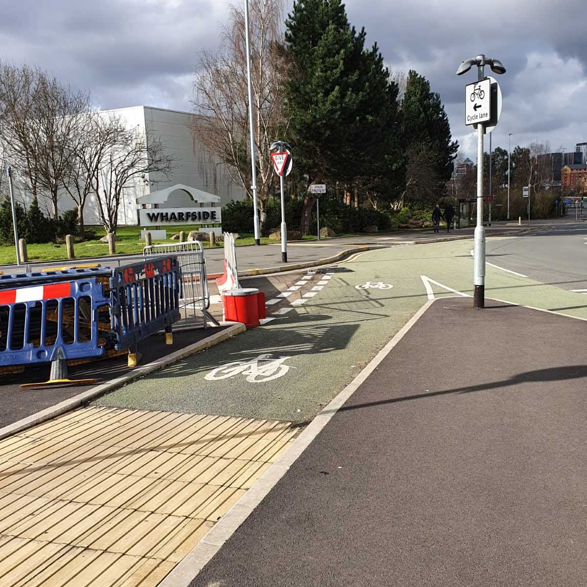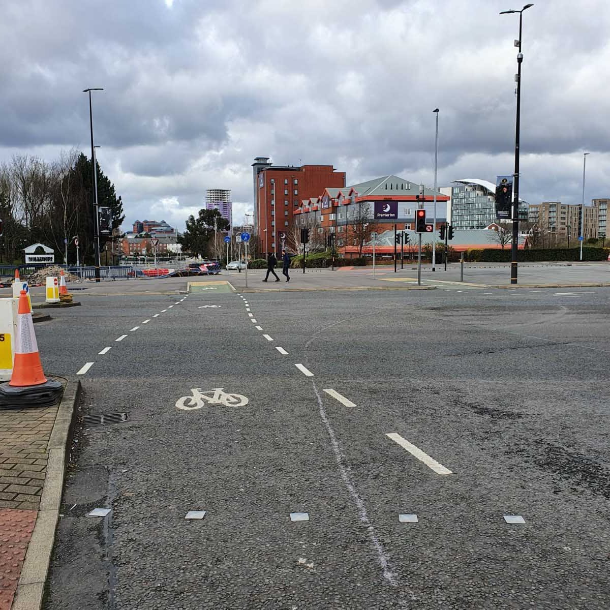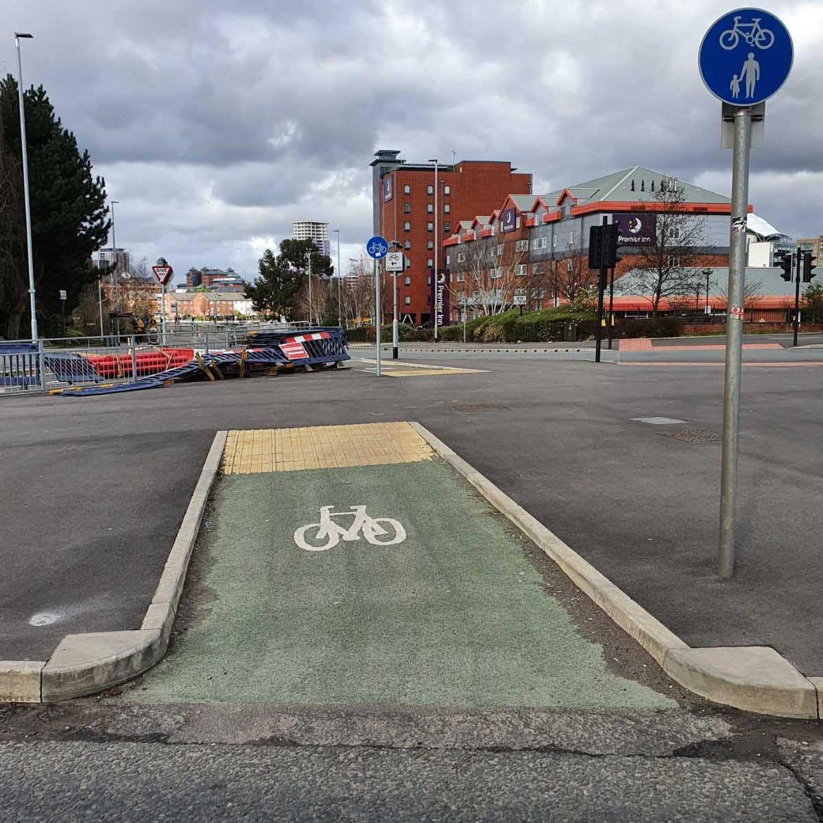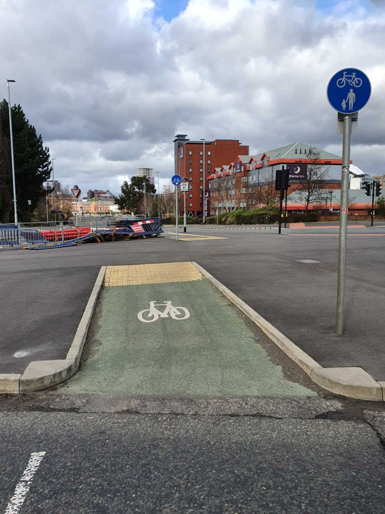 Coming from Trafford Wharf Road, you’re forced off the shared use path and onto the road, in the path of accelerating vehicles. Something that clearly deserves to be featured on Bollocks Infra.