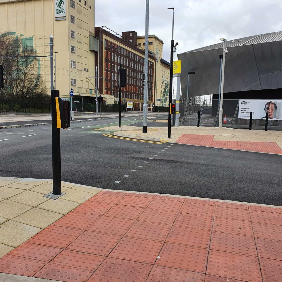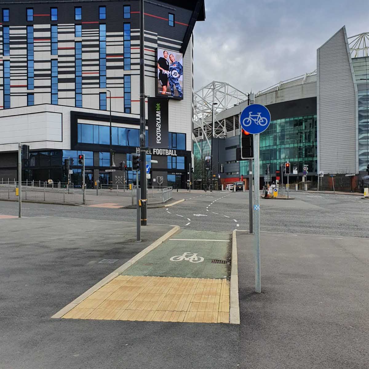 It’s still possible to cross on bike, though the arrangement is a little odd. Coming from Sir Matt Busby Way, there’s a ramp up from the road, which leads you to a large shared use area. There’s then a ramp down to Sir Alex Ferguson Way, which doesn’t line up.