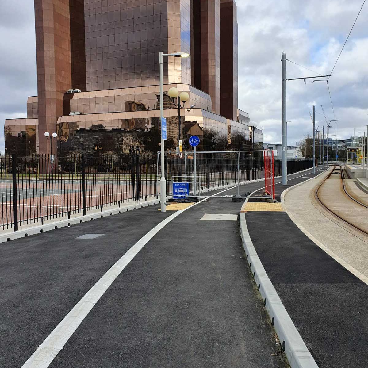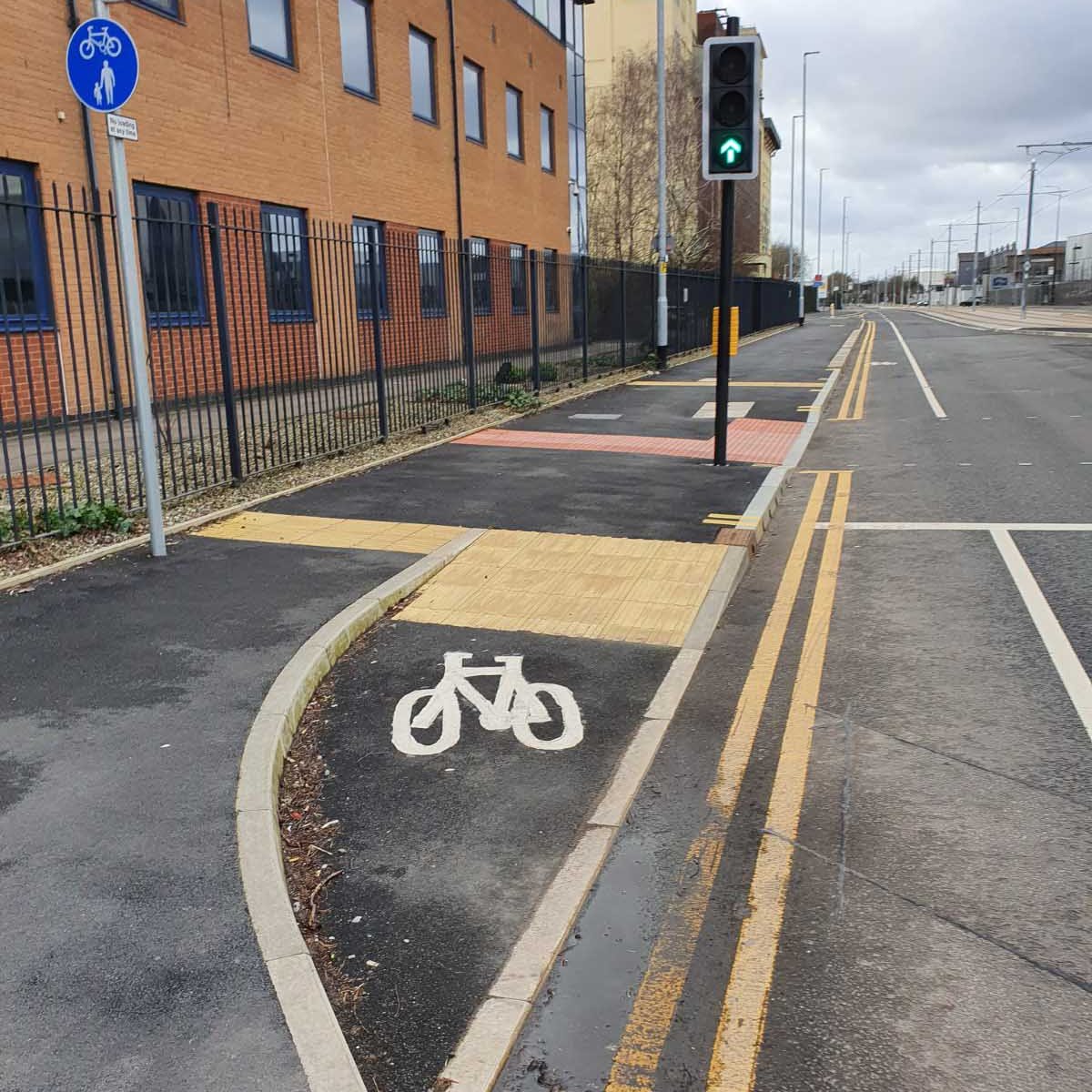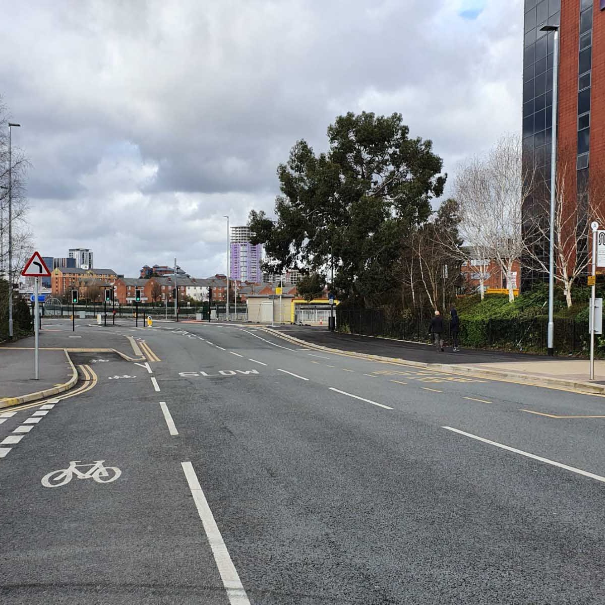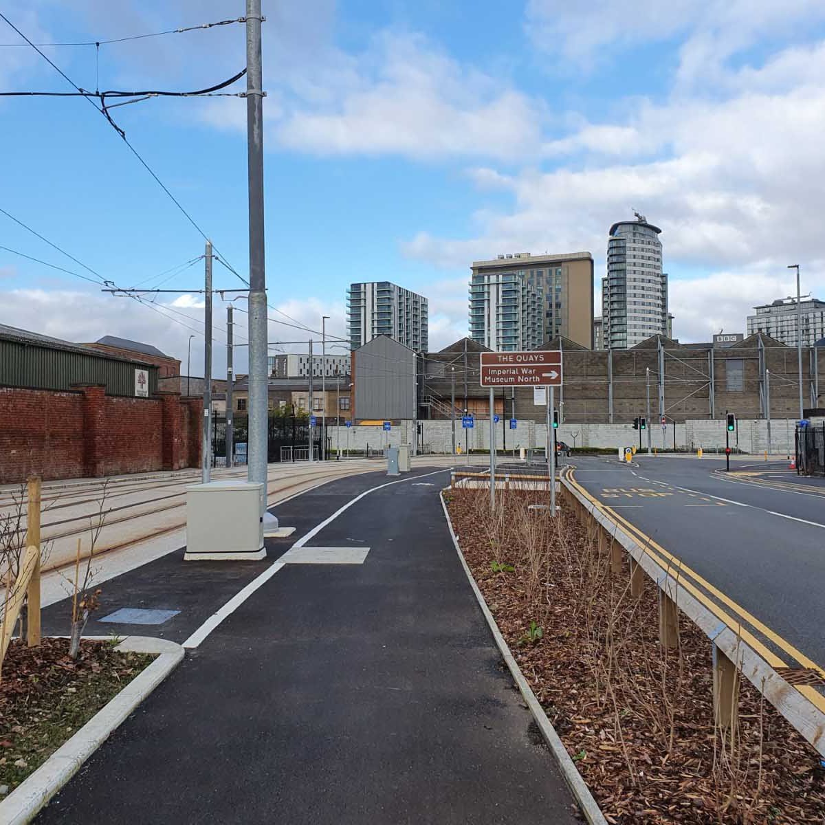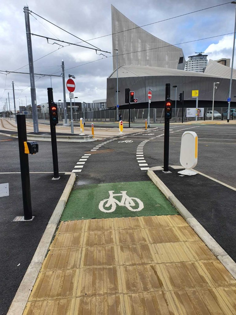 Things take a turn for the worse once you reach the IWM North, at the junction where the Metrolink joins Trafford Wharf Road. In a long tradition of creating badly designed and confusing junctions, this is up there with some of TfGM’s best (worst) work.