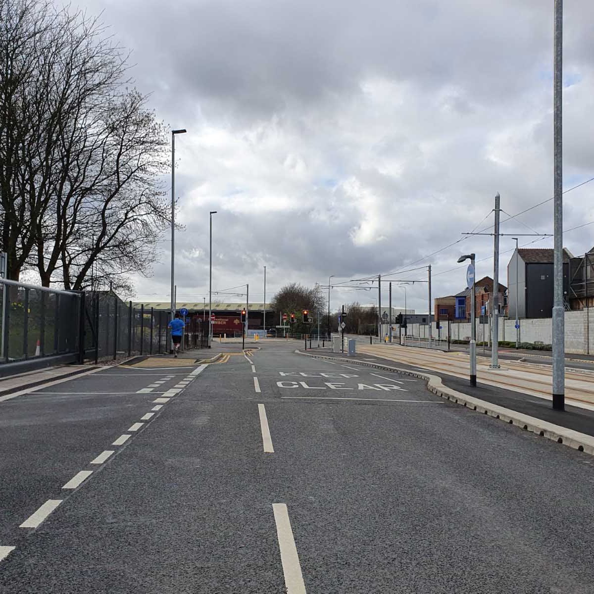 The changes on Sir Alex Ferguson Way start at the junction with Wharfside Way. It’s now no longer possible for motor vehicles to cross to and from Sir Matt Busby Way, which makes sense, since Sir Matt Busby Way is not a through route any more.