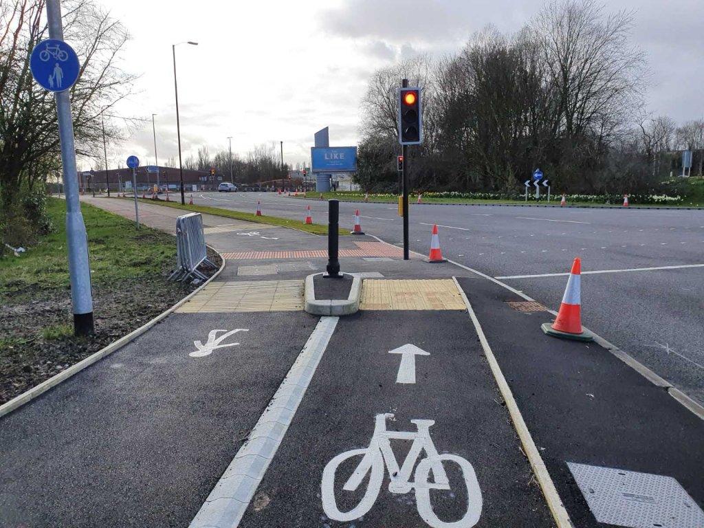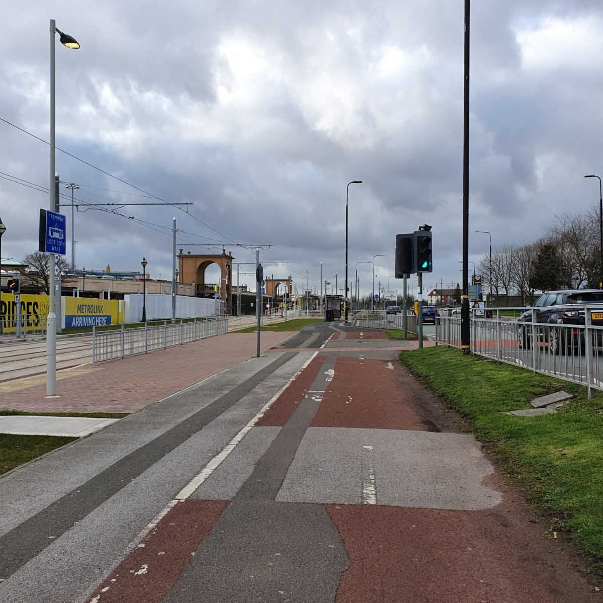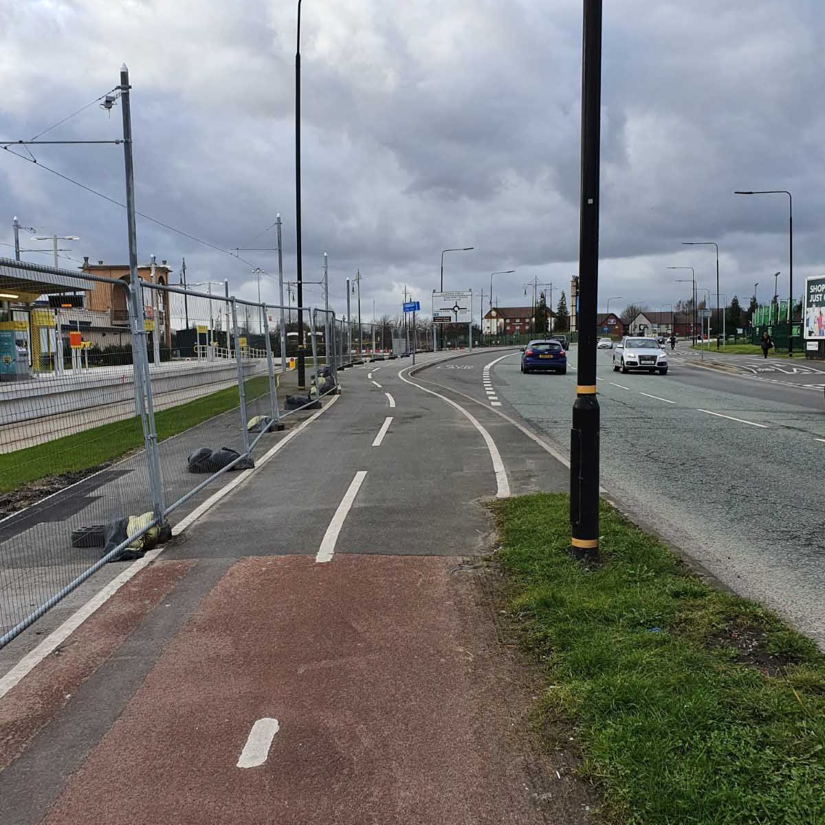 The changes on Village Way start at Village Circle, which now has Metrolink lines and a carriageway running through it. There isn’t a great deal of difference for walking and cycling here and it still takes forever to cross, with the number of stages and the lack of priority at the lights.