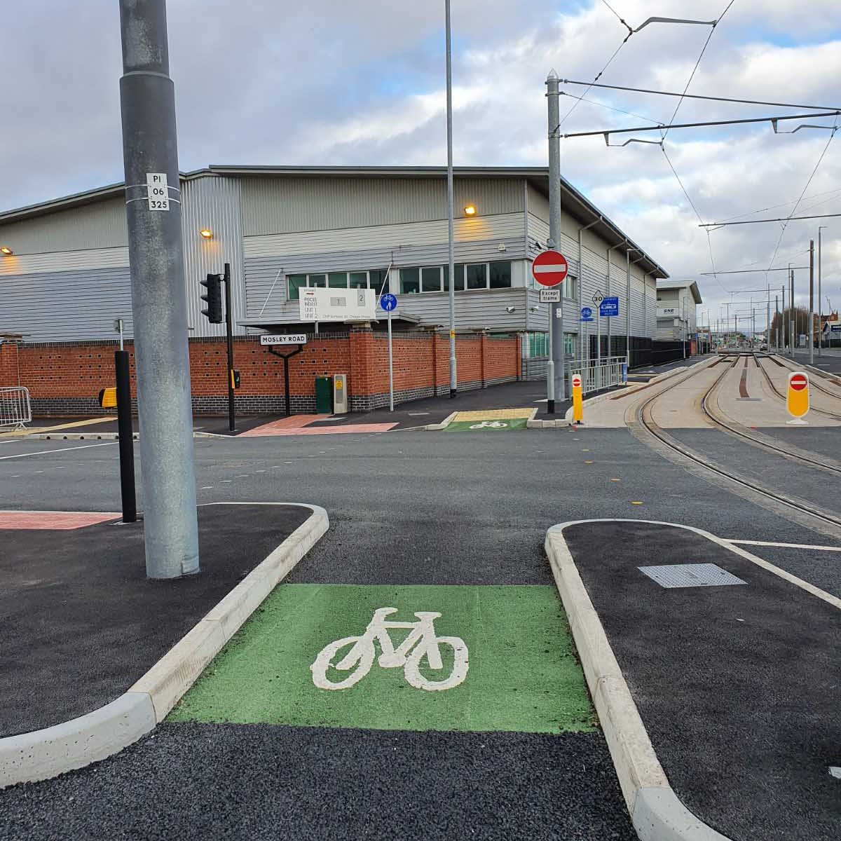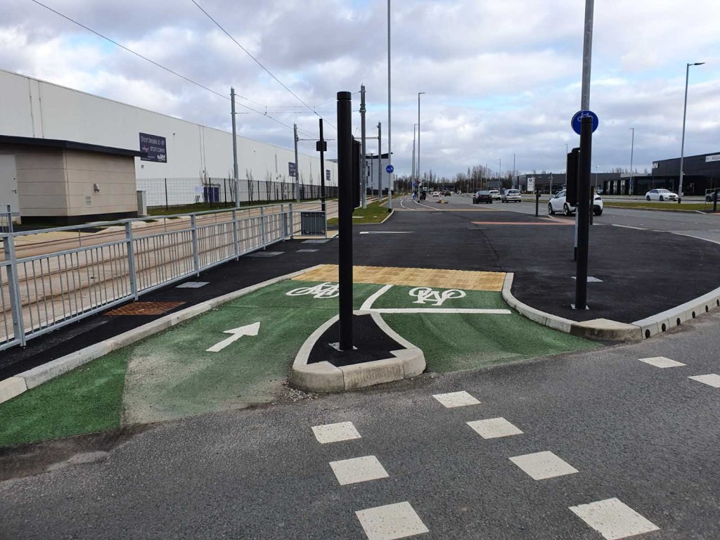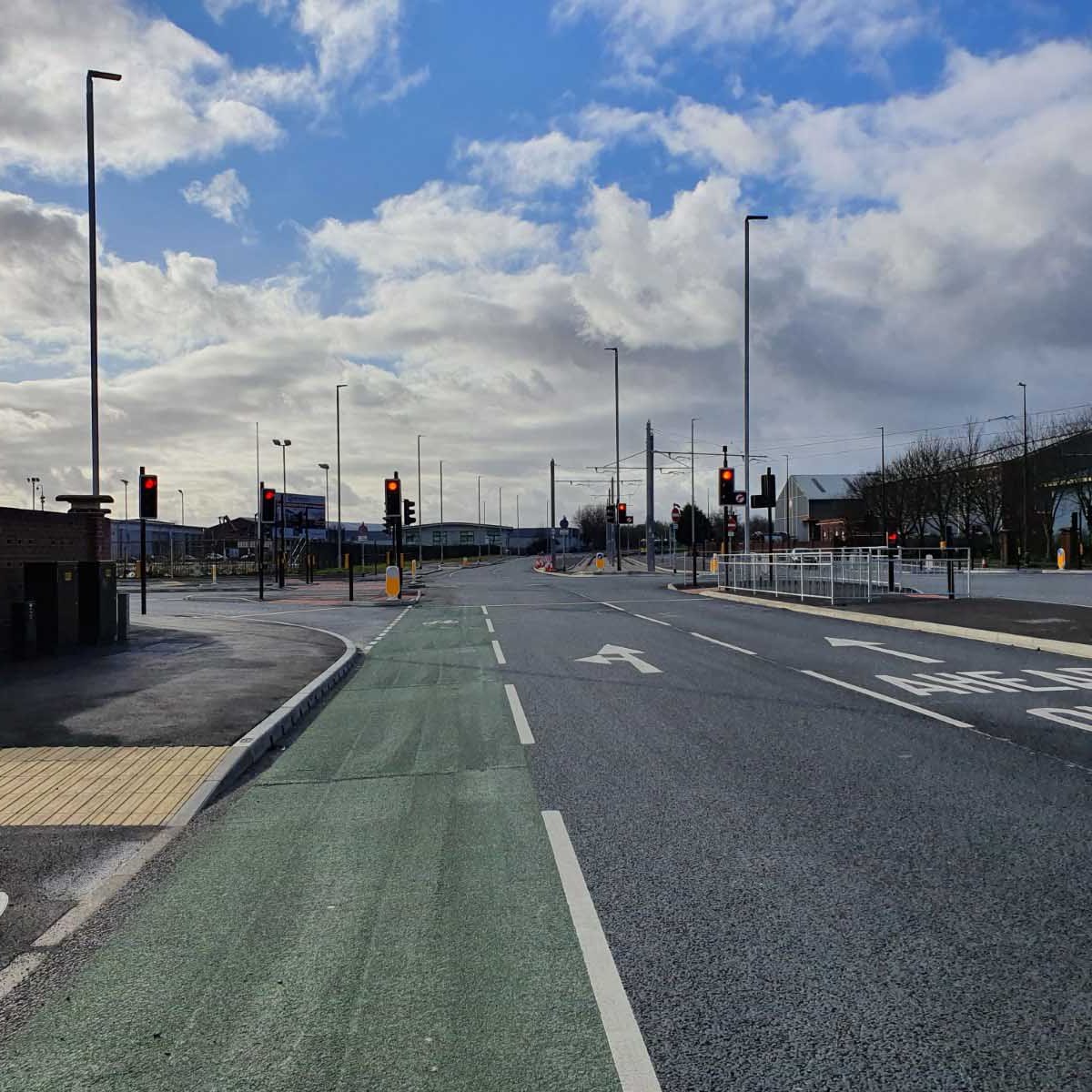 The changes on Village Way start at Village Circle, which now has Metrolink lines and a carriageway running through it. There isn’t a great deal of difference for walking and cycling here and it still takes forever to cross, with the number of stages and the lack of priority at the lights.