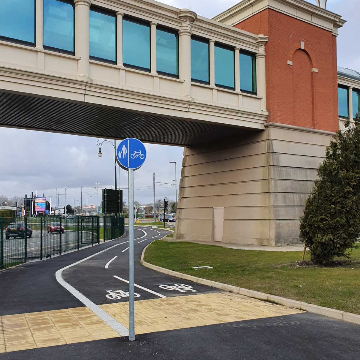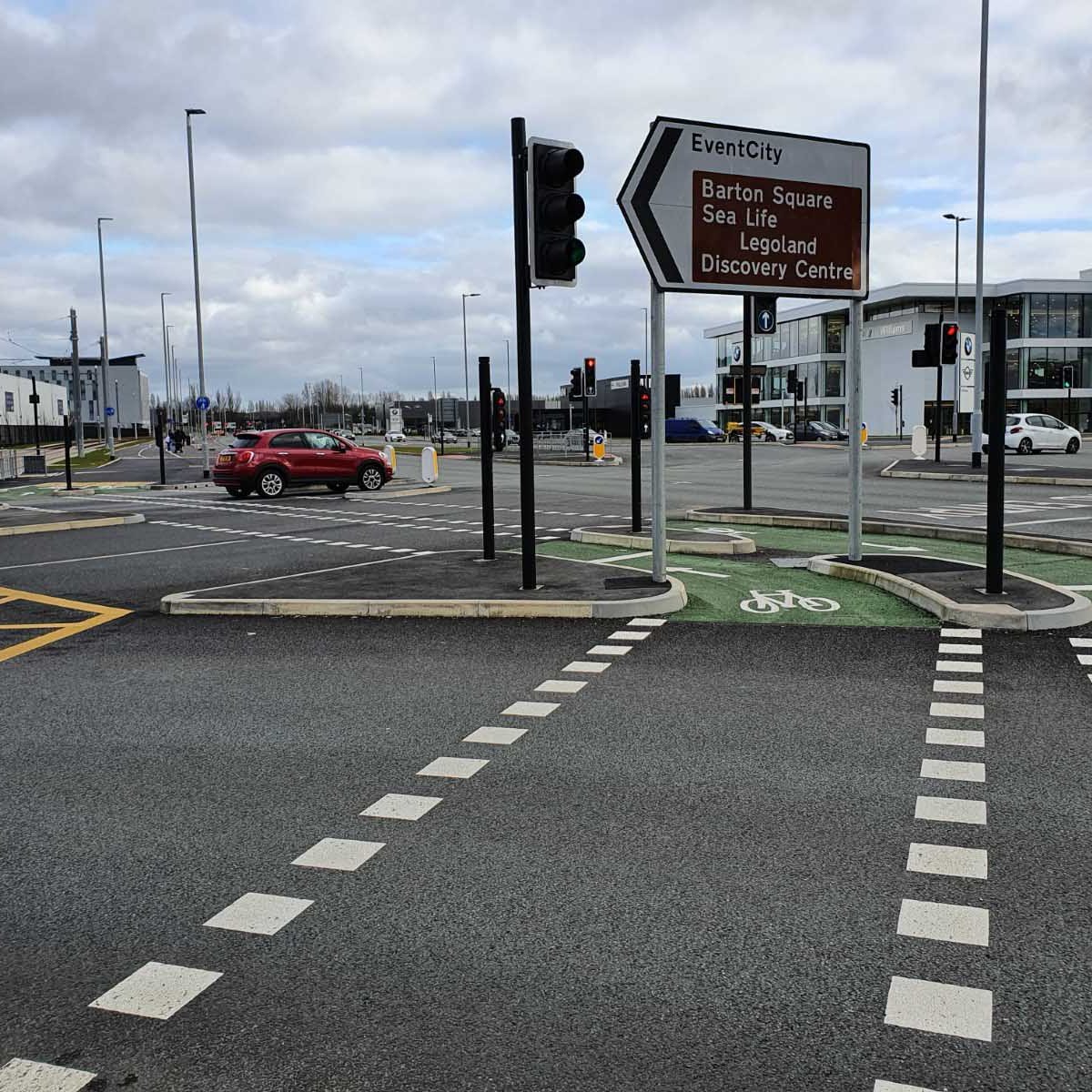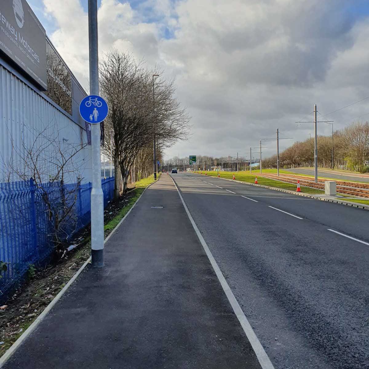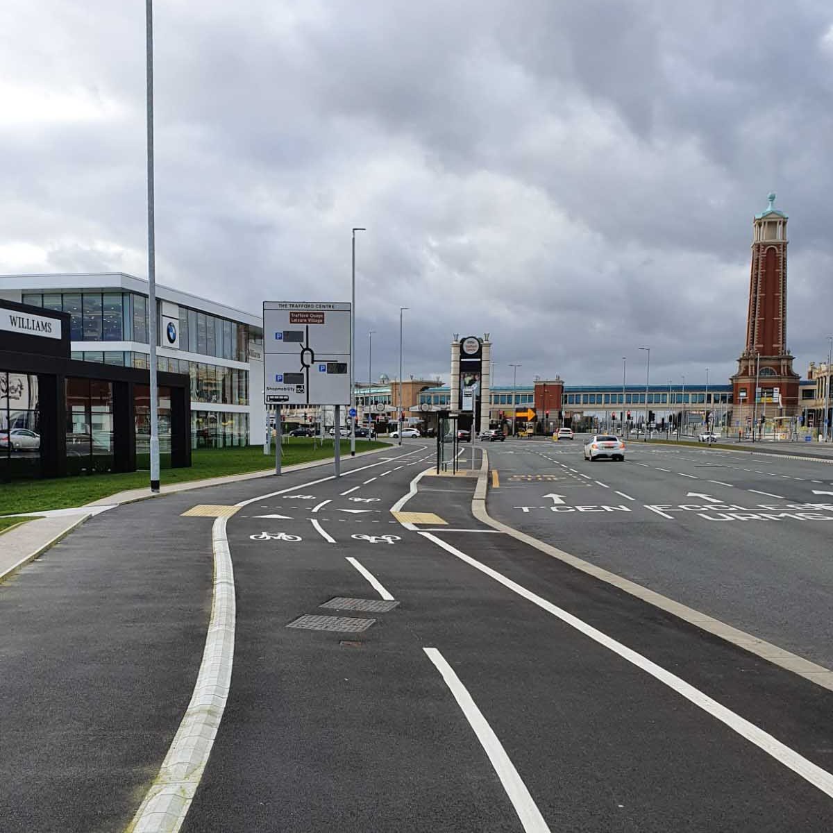 Once you’ve eventually got through Peel Circle, the cycleway continues as it meanders the perimeter of The Trafford Centre. It then carries on as a mixture of existing and new cycleways, plus some sections of shared use paths with the usual obstacles. It’s not brilliant, but it’s not terrible, and it’s much safer than riding along the road, which has an inappropriate 40mph limit.