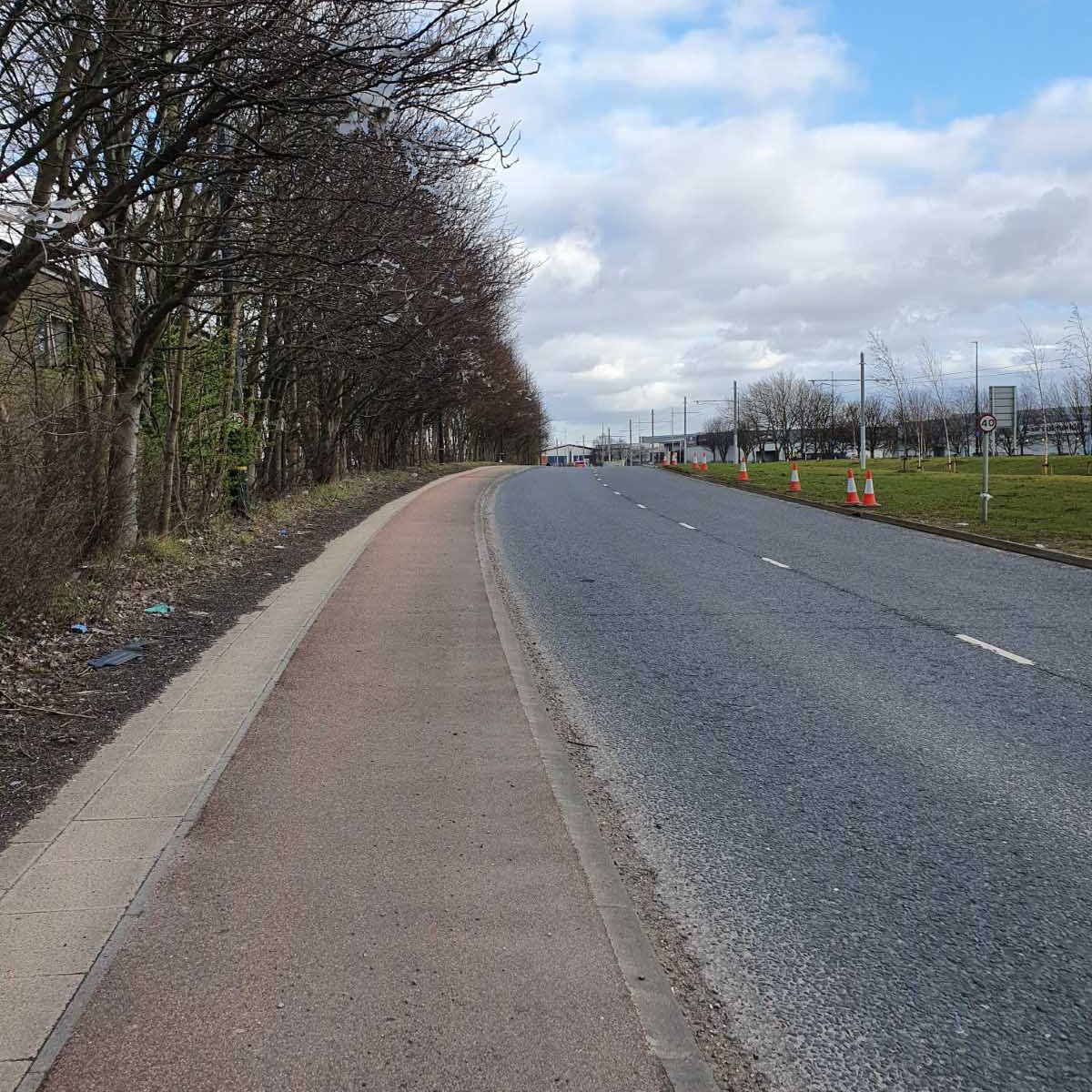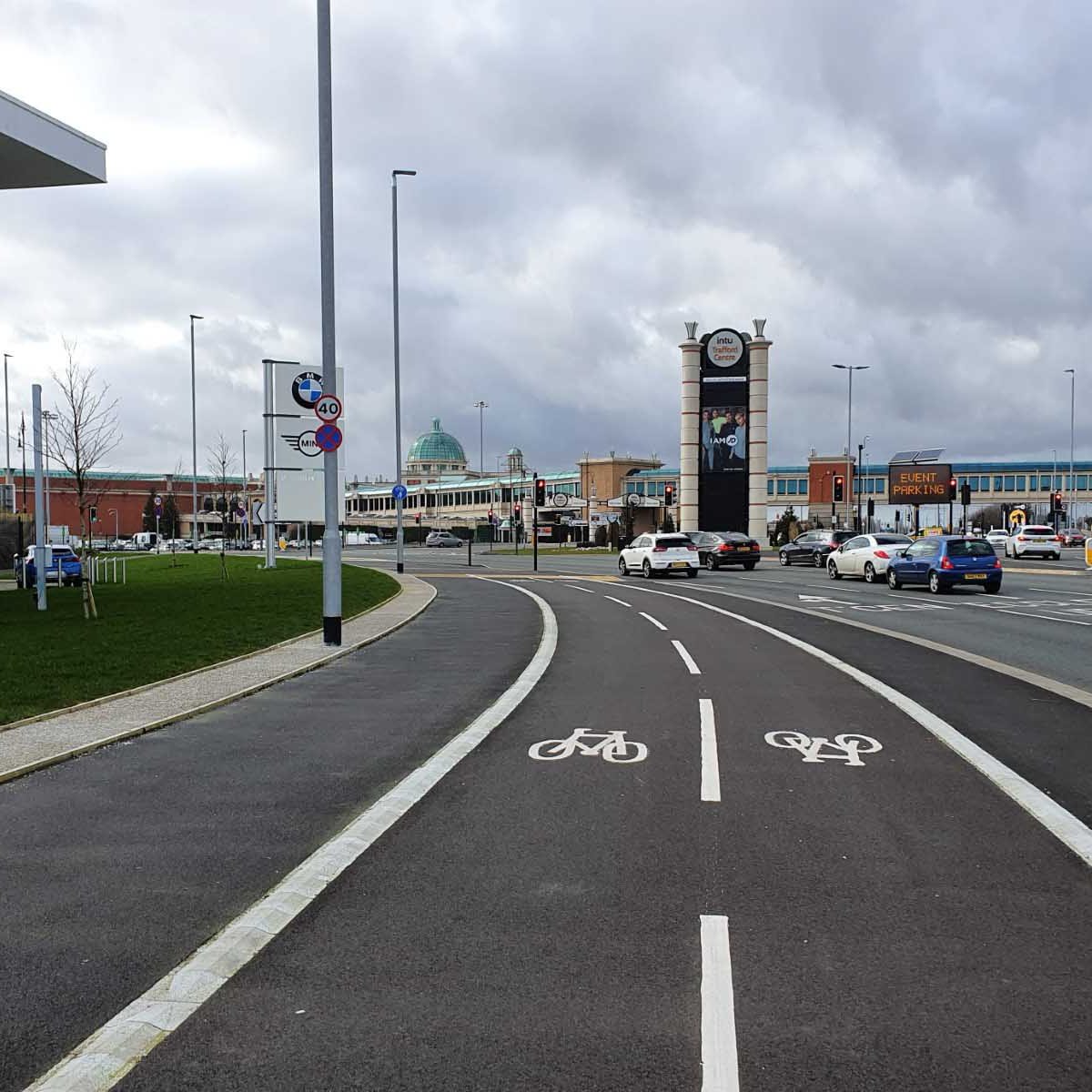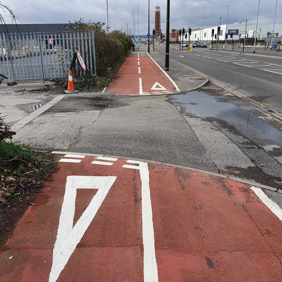 Crossing the road onto the eastbound side, things are a little more mixed. It starts with the existing cycleway, which has been resurfaced. Reaching Bright Circle, you hit the very real obstacle of crossing the turning for Asda and Costco. The combination of informal crossings and lots of speeding traffic makes this a frustrating and dangerous place to cross, either on foot or bike.