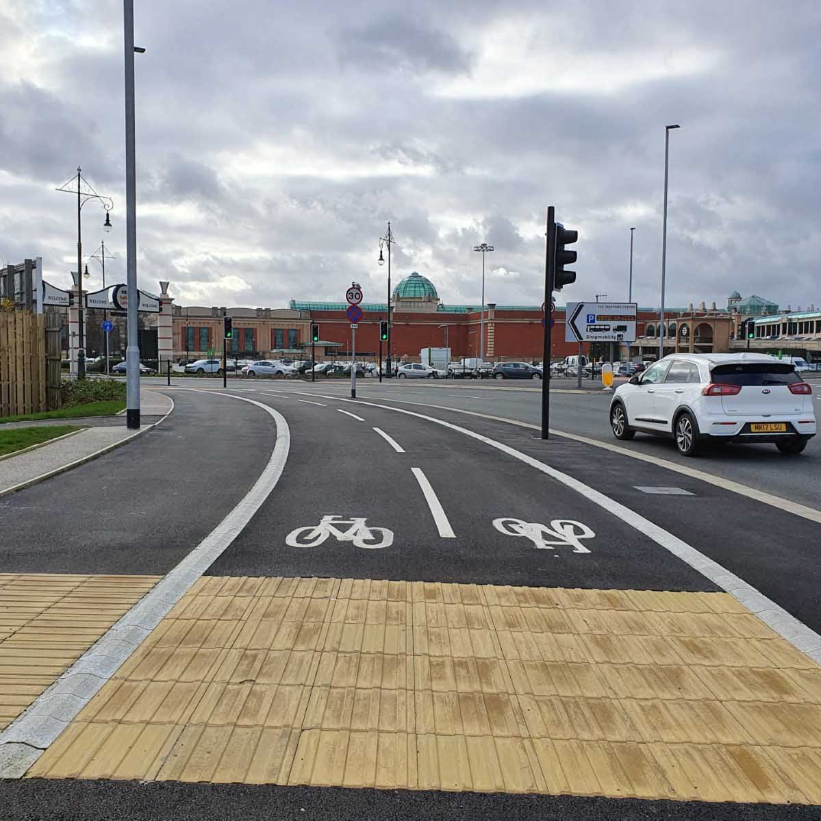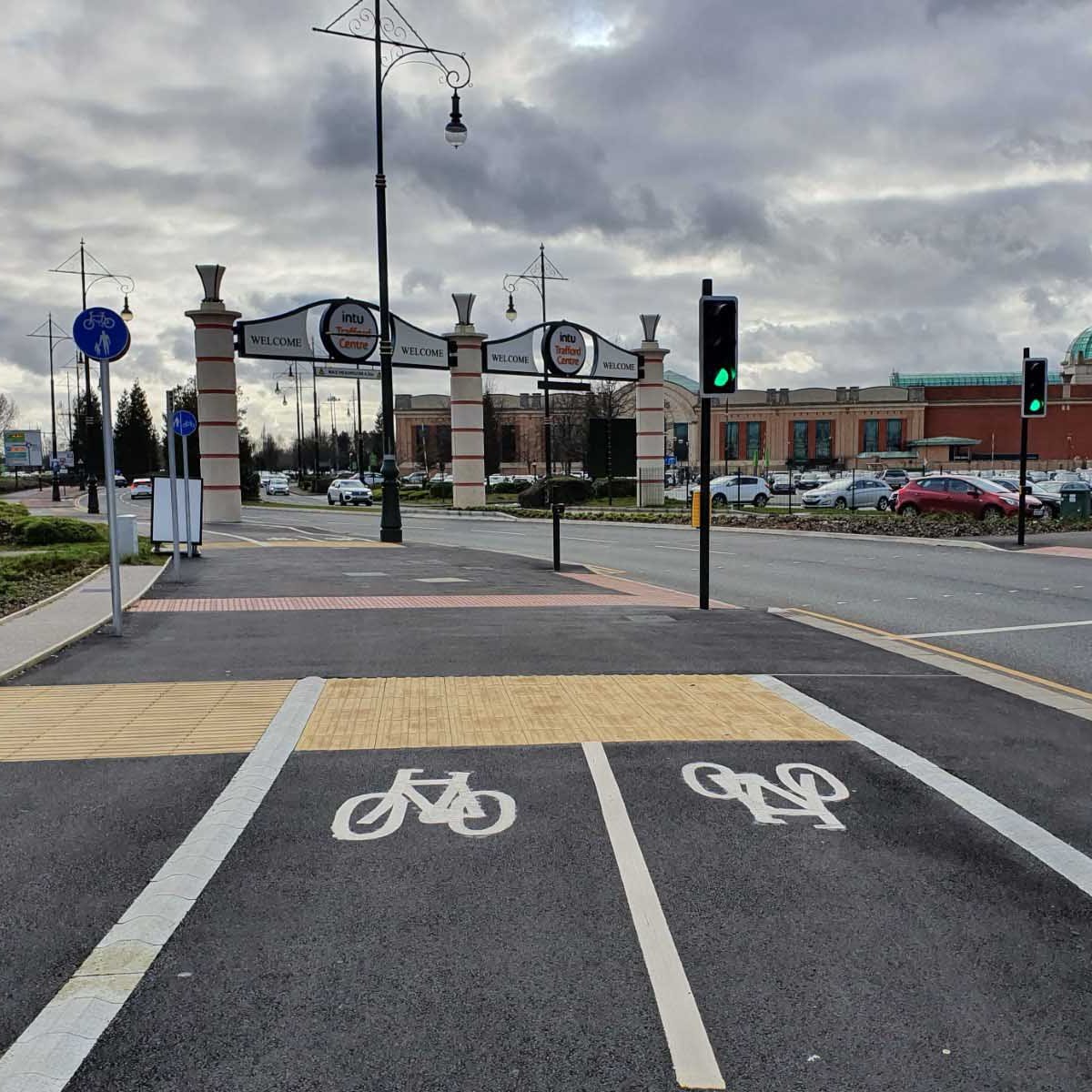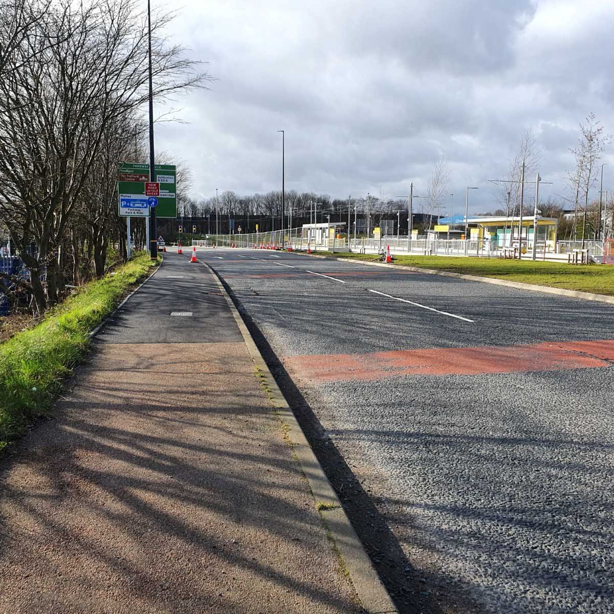 Crossing the road onto the eastbound side, things are a little more mixed. It starts with the existing cycleway, which has been resurfaced. Reaching Bright Circle, you hit the very real obstacle of crossing the turning for Asda and Costco. The combination of informal crossings and lots of speeding traffic makes this a frustrating and dangerous place to cross, either on foot or bike.