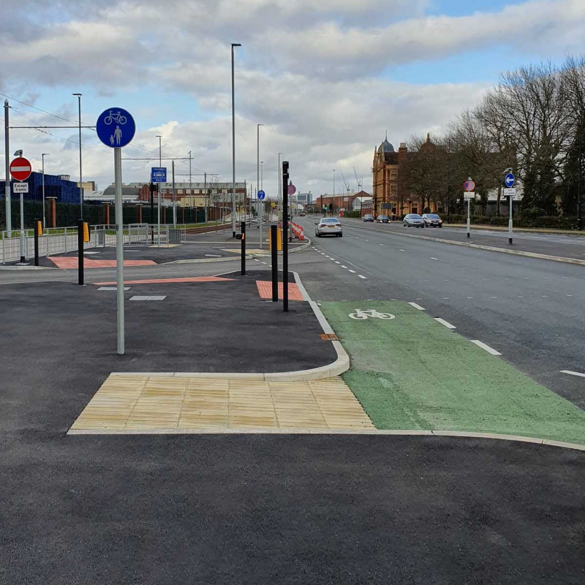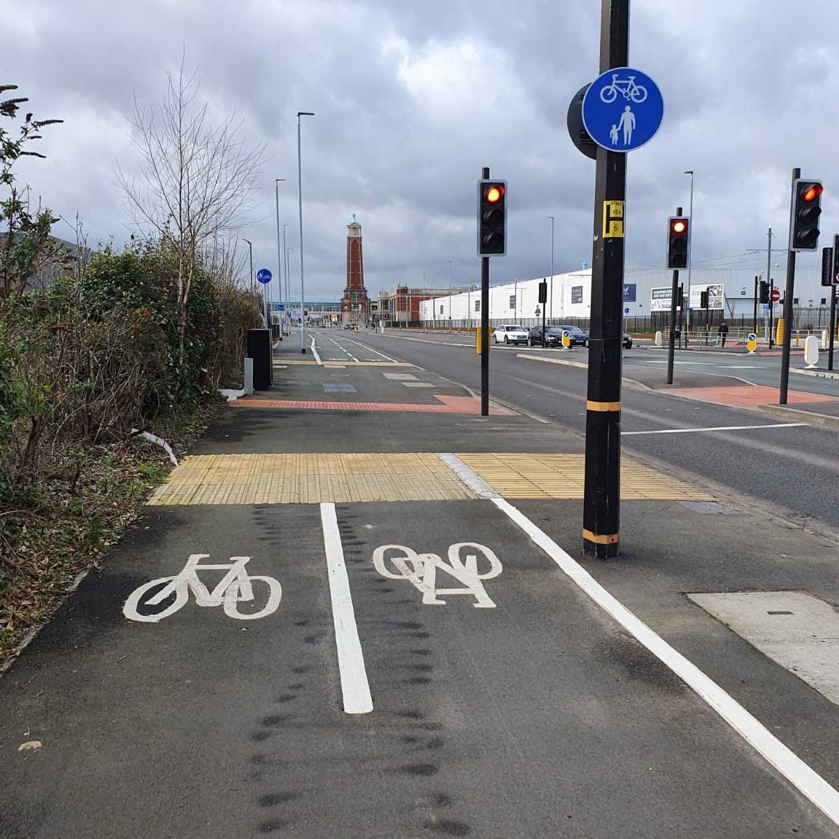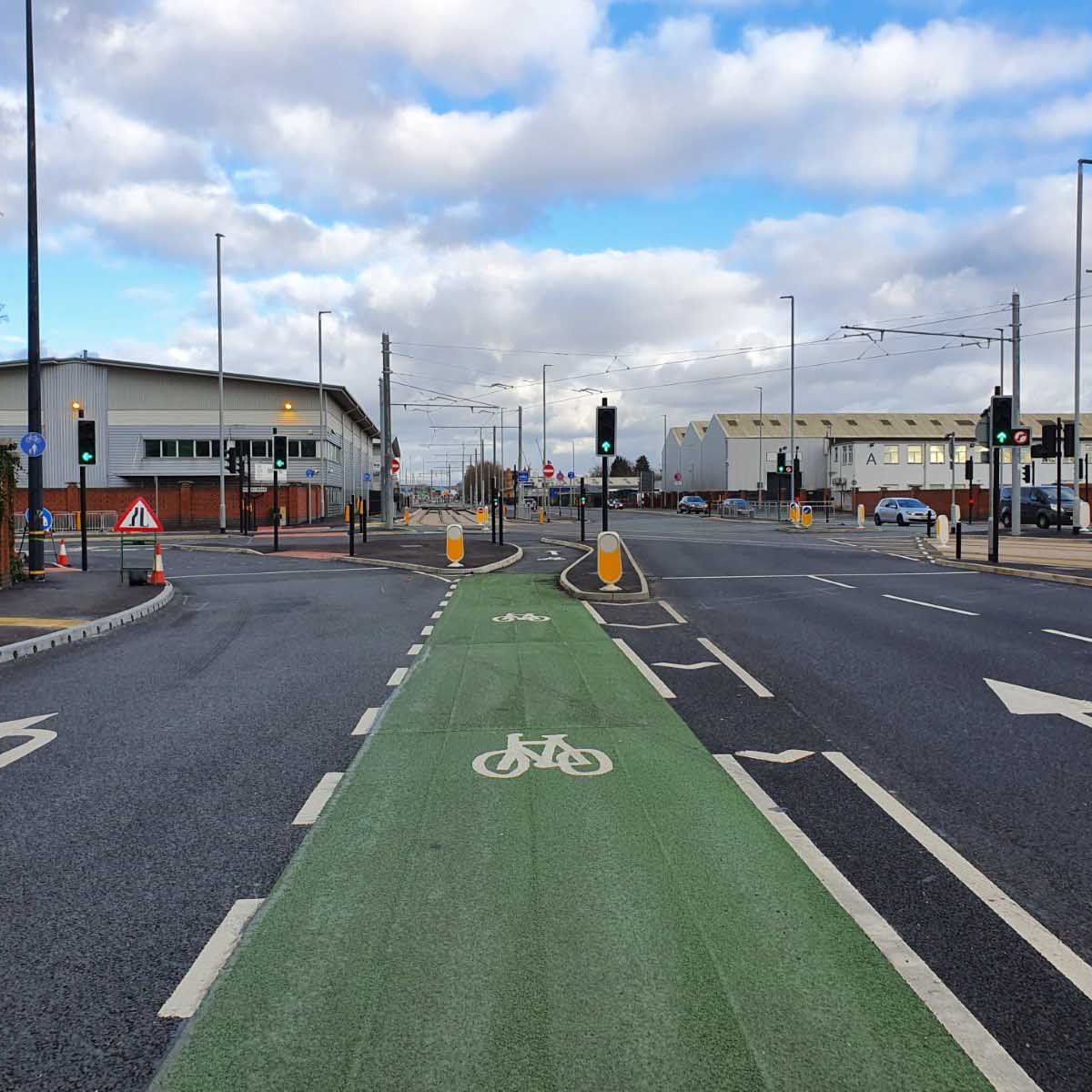Once across the lights, you carry on along the existing bidirectional protected cycleway. There’s signs of some patchwork improvements here and newly painted markings, but not much more. At the Mercury Way junction, the existing cycleway gives way to a newly laid bidirectional cycleway. The cycleway and footway swap sides for some reason, something which will lead to unecessary conflict.