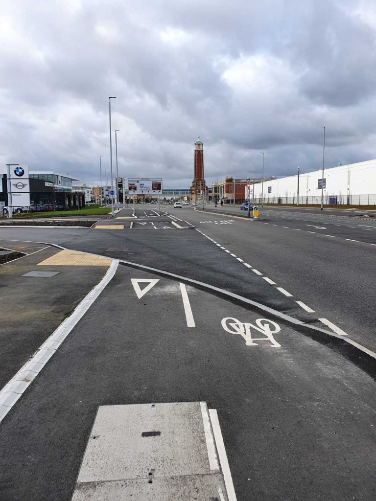 What really lets this section of the route down is the lack of priority at the side junctions. This is particularly true at the turning for the new car dealerships. The size of this turning and radius of the corners is completely inappropriate. The junction is so wide, they’ve had to put an refuge island in the middle.
