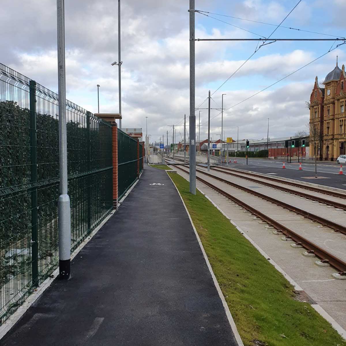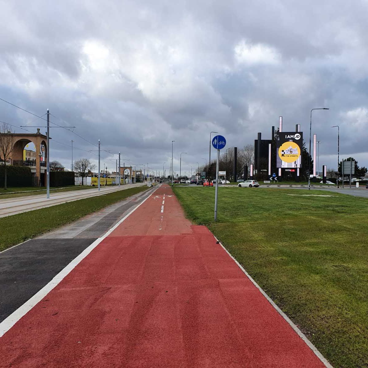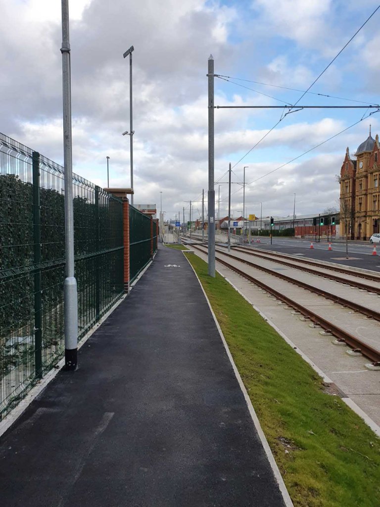 On the other side of the junction, you’re led onto another shared use path, then over the tram tracks at a slightly awkward crossing for bikes. The shared use path then carries on parallel to the tram lines as you negotiate a slalom of posts for overhead power cables, street lights and road signs. Could this not have been organised a little better?