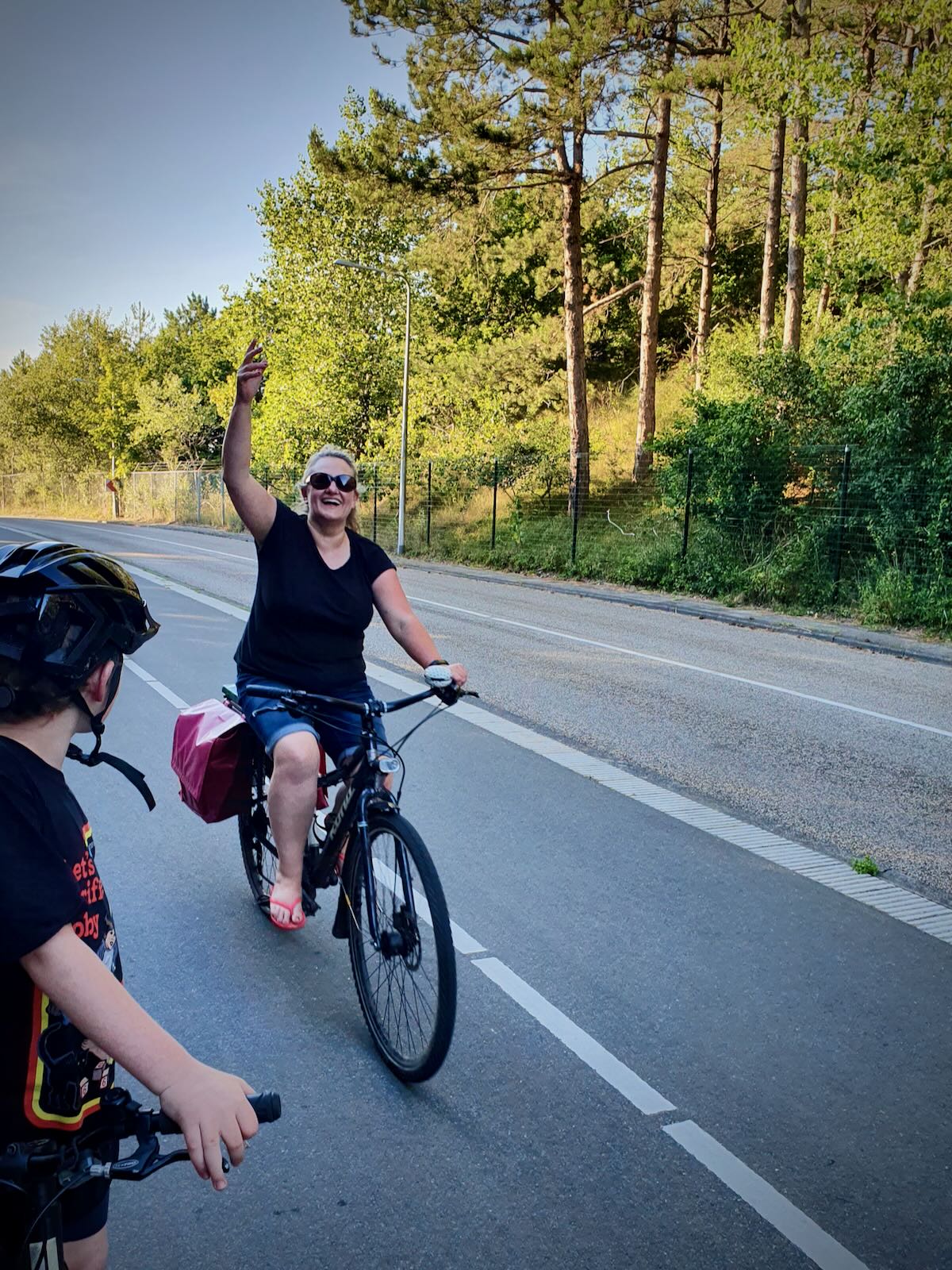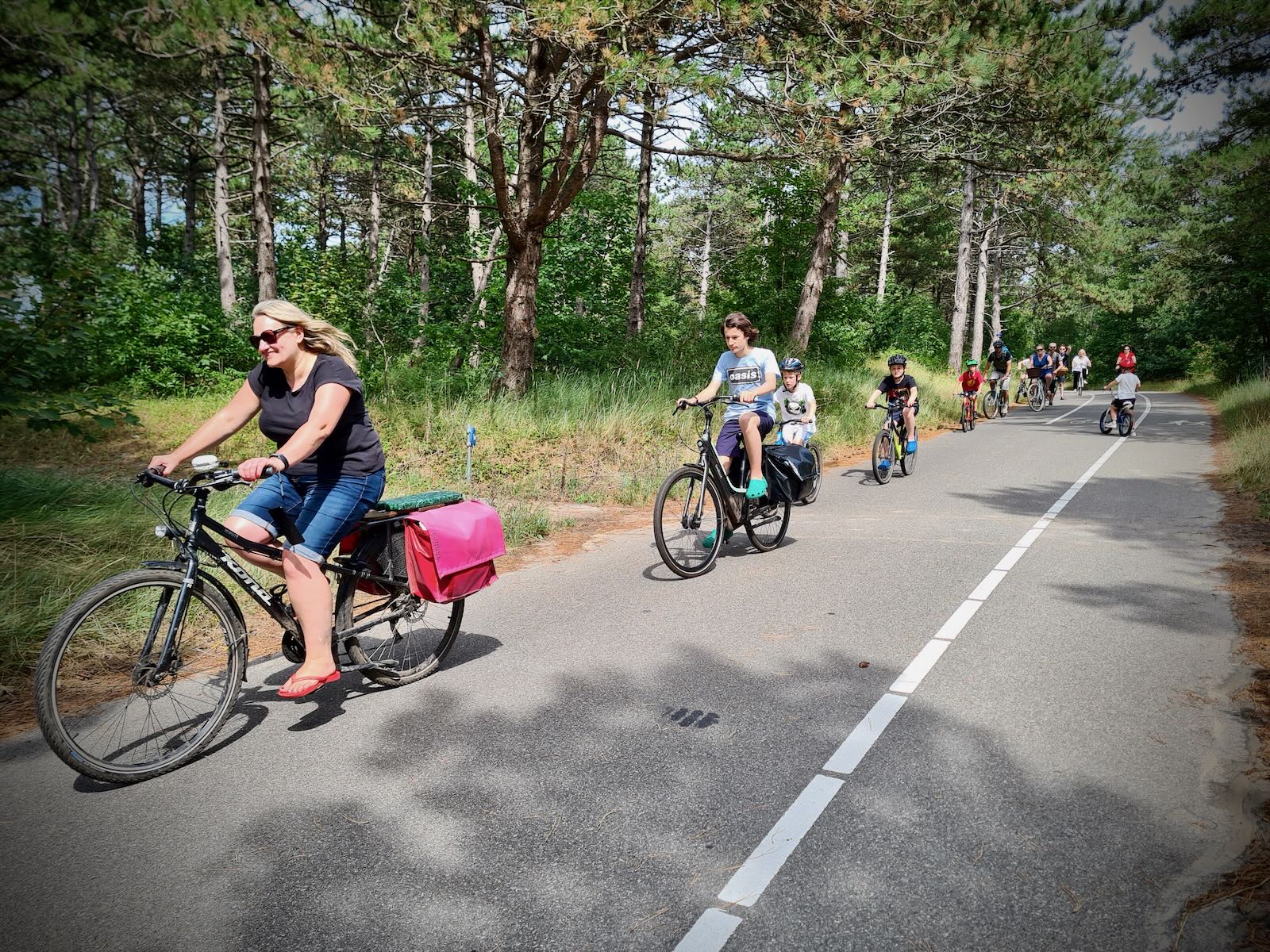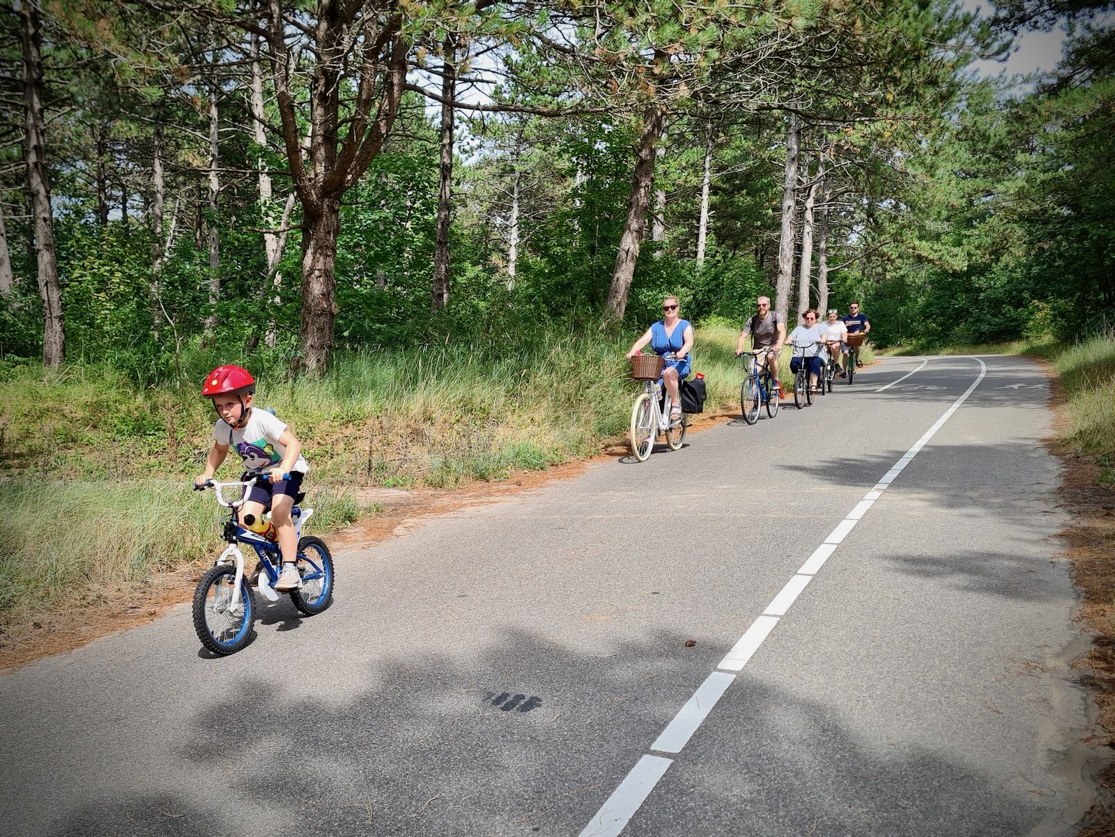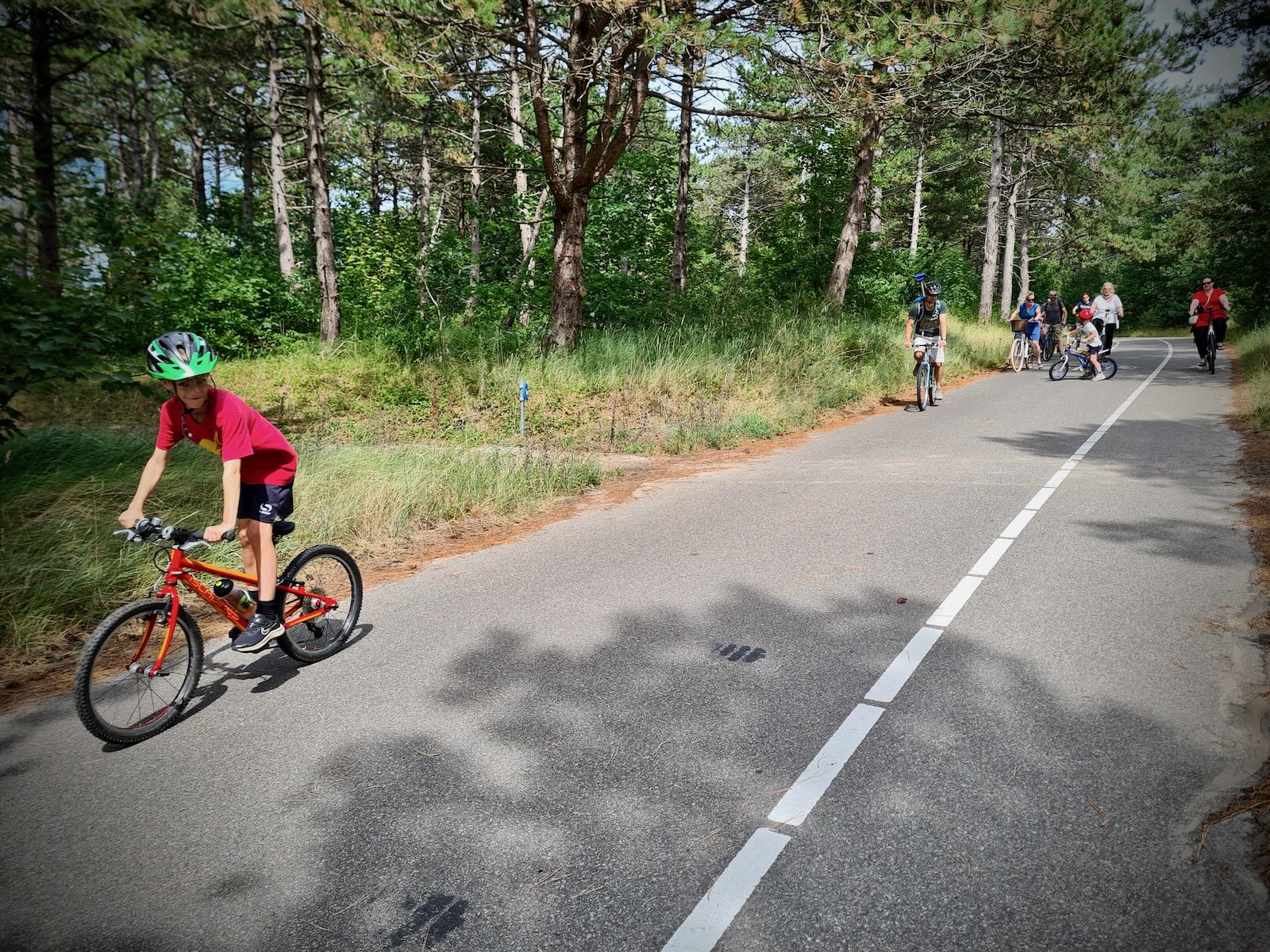 Once over the top, the footway and cycle cycleway continue as a single path, with painted lanes. One for walking and two for cycling, in either direction. This is generally pretty good, but it does get a little congested at times. The path continues to undulate as you ride through the Dunes. Overall, it’s a really pleasant ride, which we all enjoy.