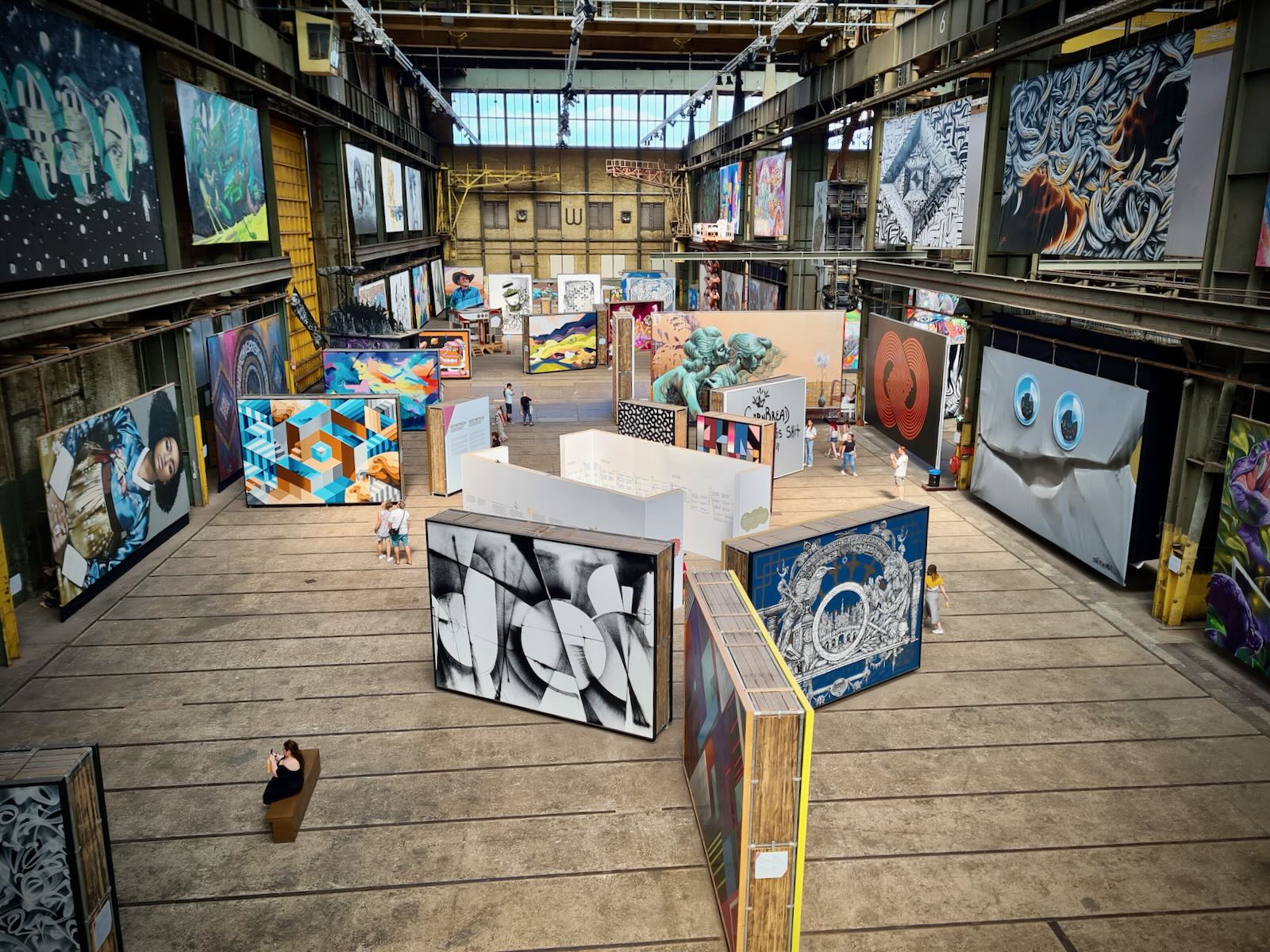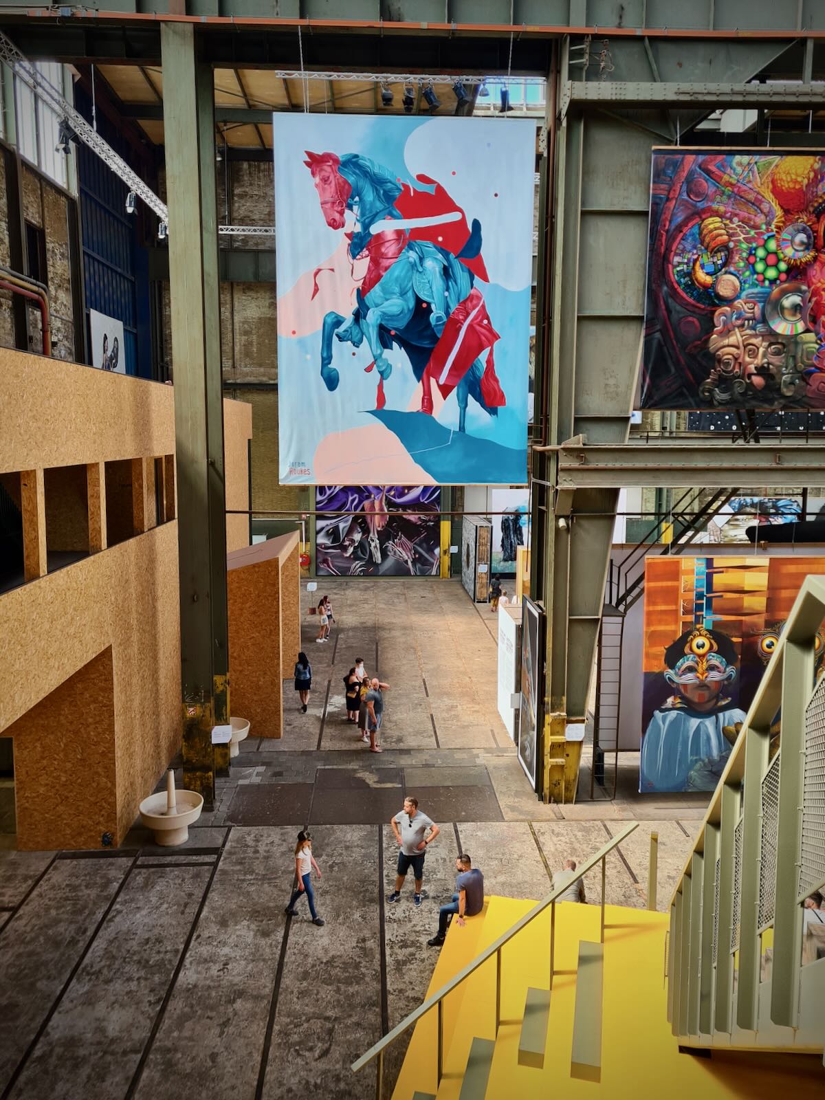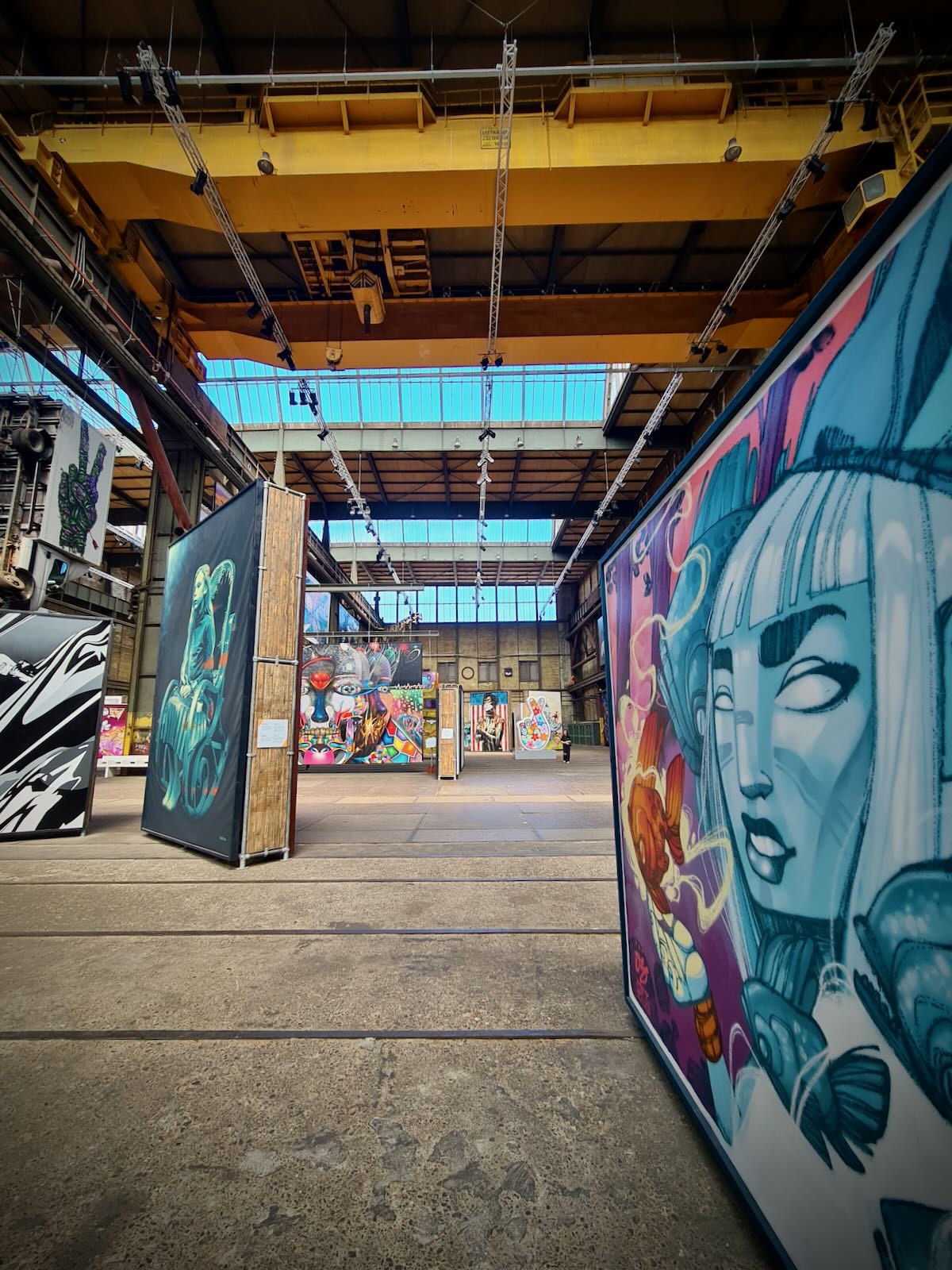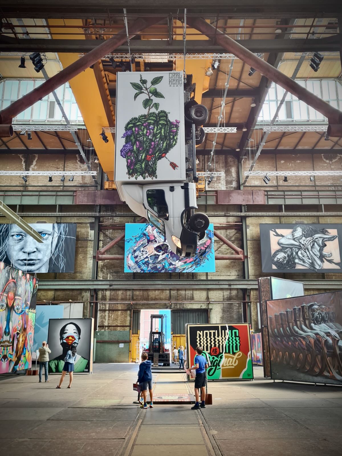 STRAAT is located in an 8000 m2 former warehouse at NSDM, which provides a fantastic backdrop for the artwork, particularly with the industrial fittings, such as the huge ceiling mounted cranes as well as a Luton van. The artwork is bathed in natural light, particularly on a sunny day, like today.