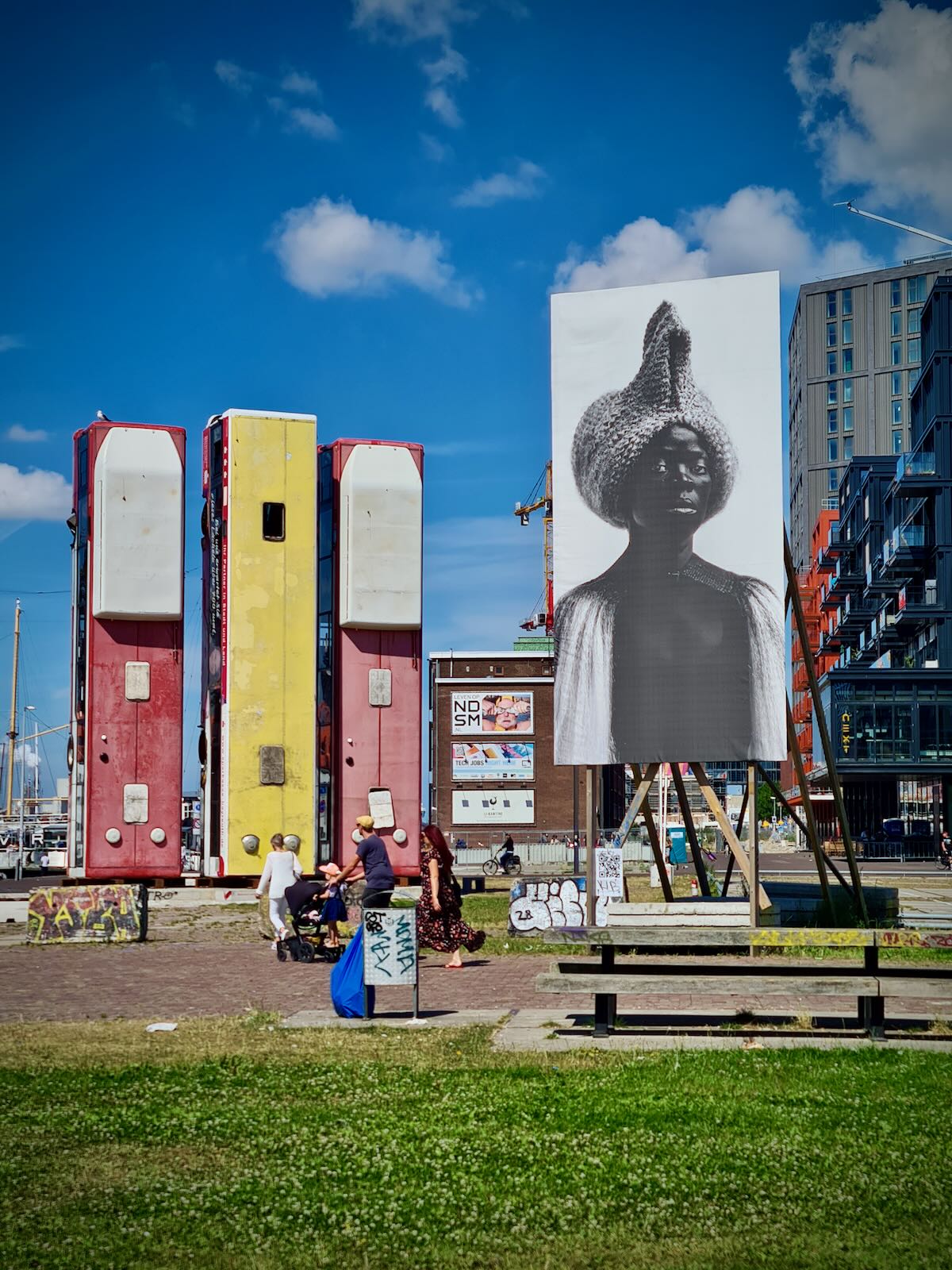 In amongst the buildings, there some large pieces of public art. The most striking is Monument by Syrian-German artist Manaf Halbouni, which consists of three upended buses. Nearby, there’s a very striking black and white self portrait by South African artist Zanele Muholi.