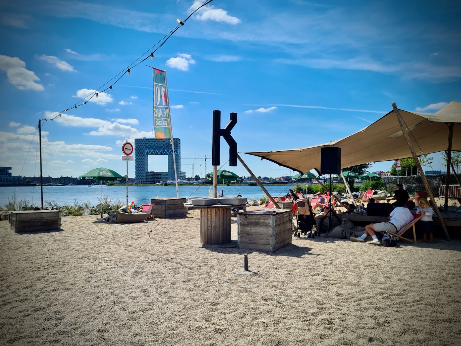 From the outside as you approach, if doesn’t look like much. But once inside, it’s really quite attractive, with its homely, but industrial look. Somewhat surprisingly, out the front of the restaurant is a beach, with lots of shaded tables and views across the IJ to Amsterdam.