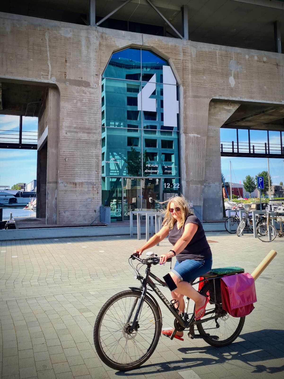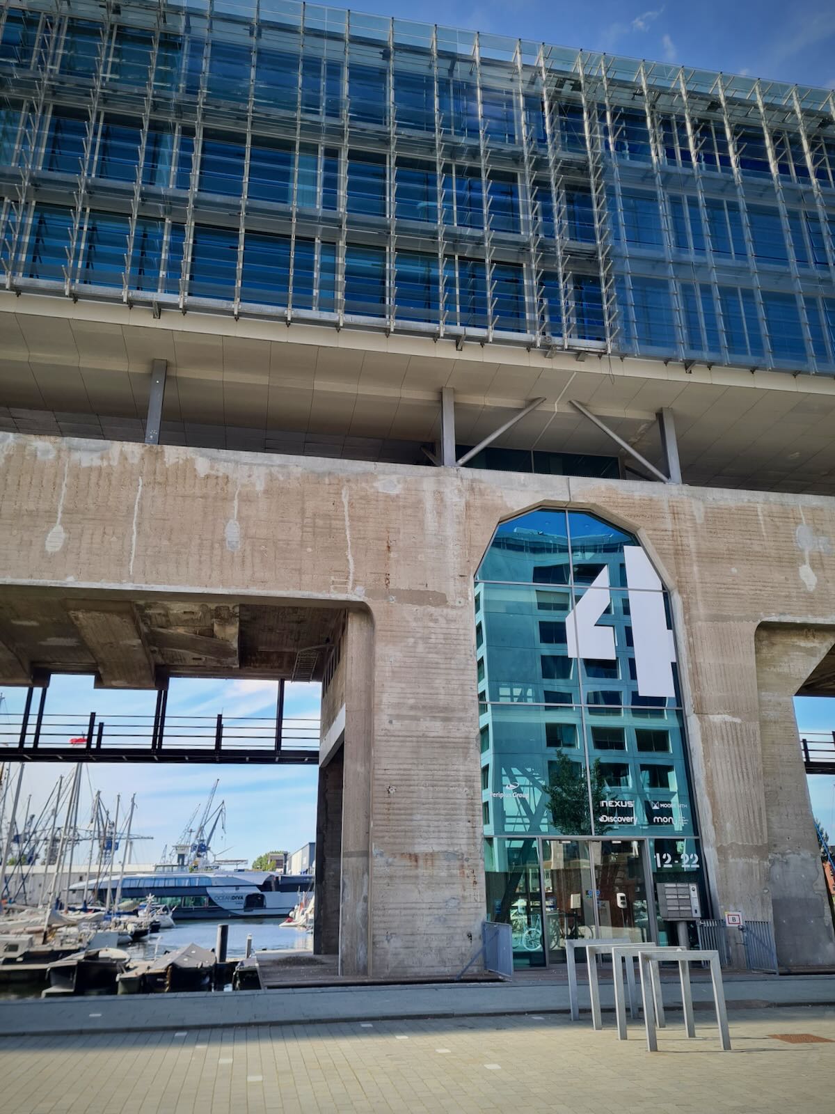 Carrying on from the ferry port, we arrived at the marina area and the interesting looking Kraanspoor office building. Kraanspoor translates as crane way, with the concrete lower half of the building being a relic of the old shipyard. A modern glass office block floats above the concrete base.