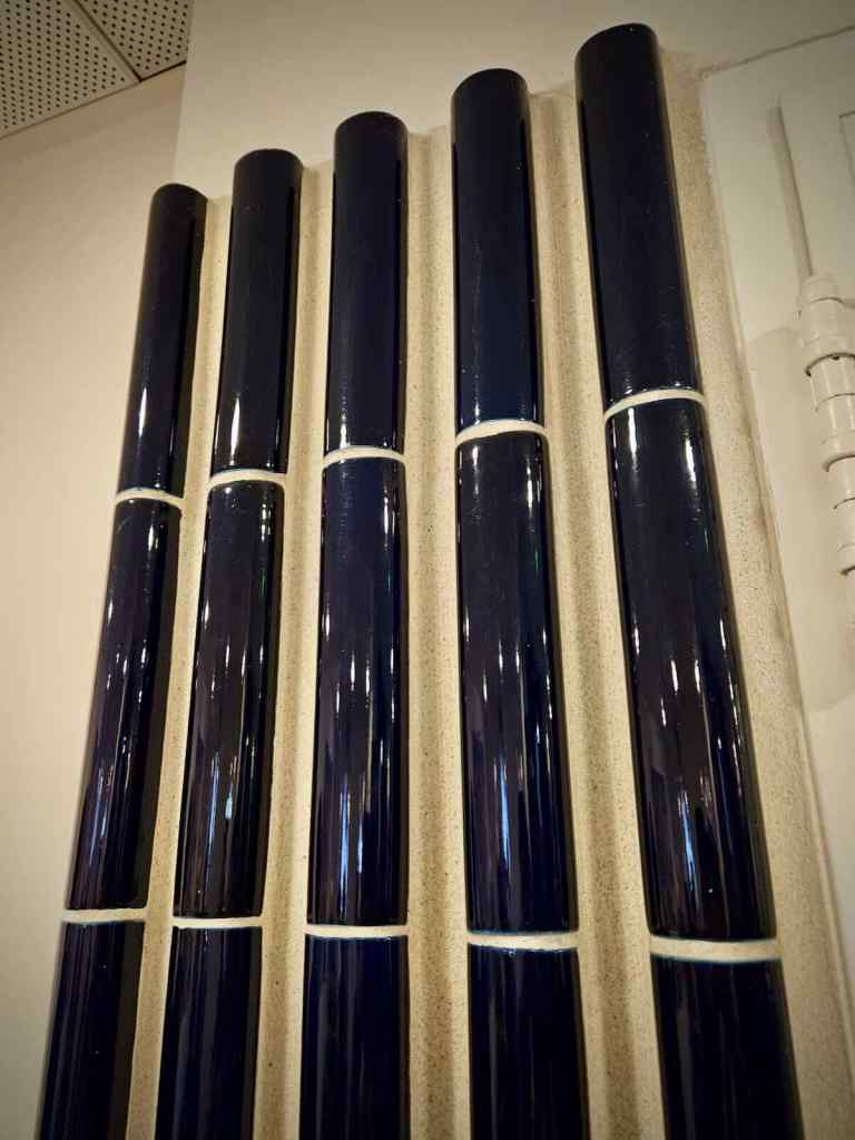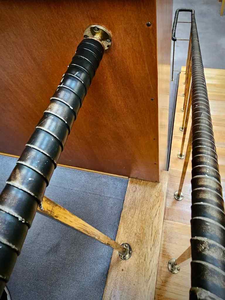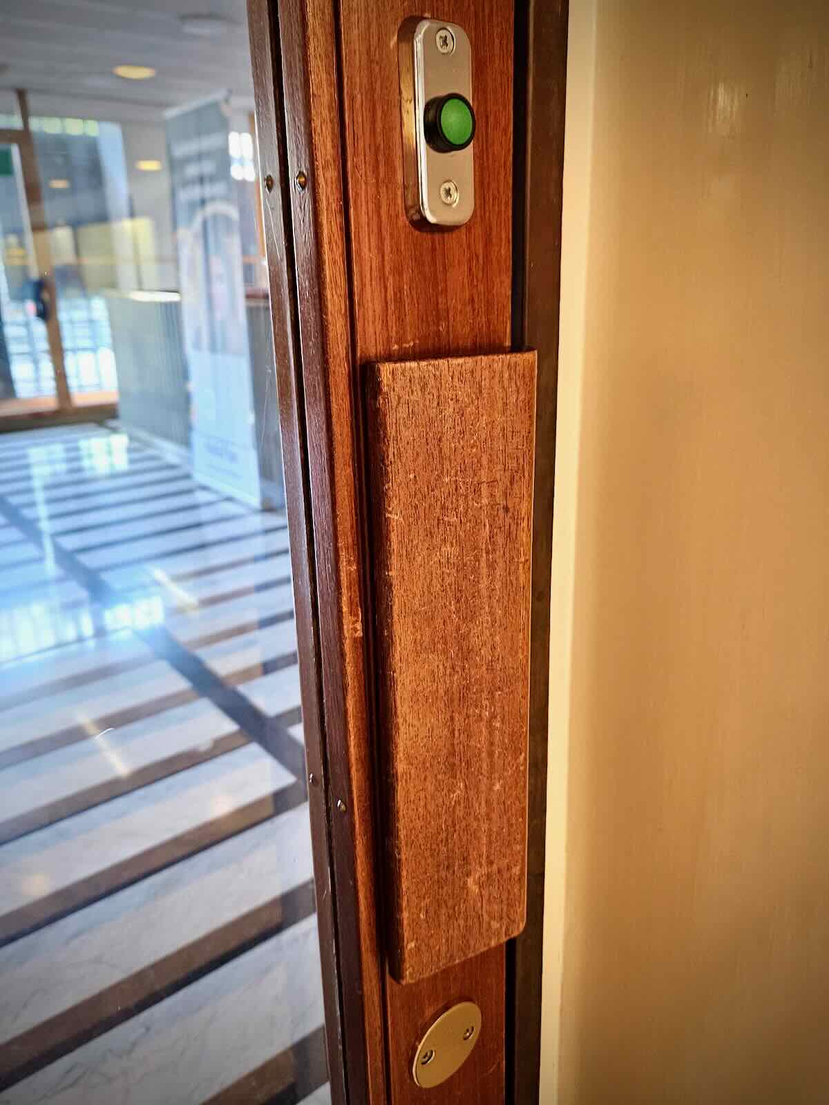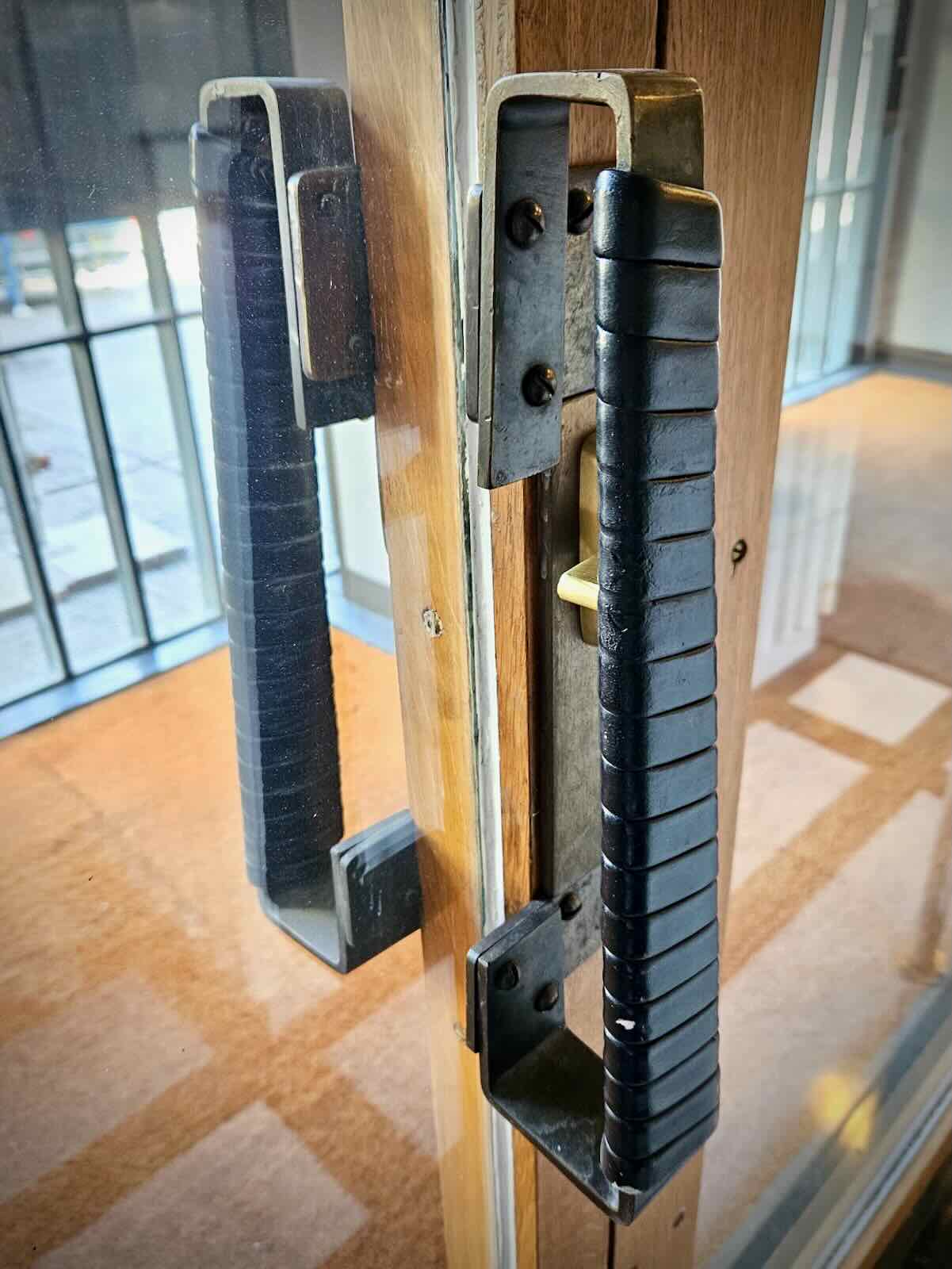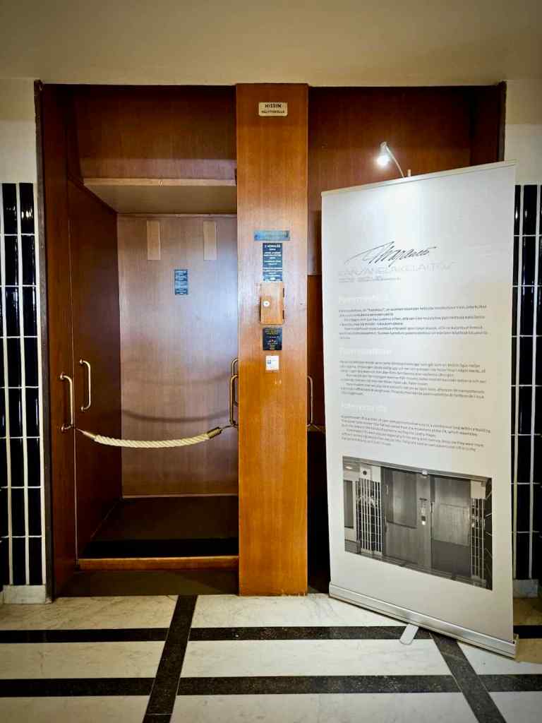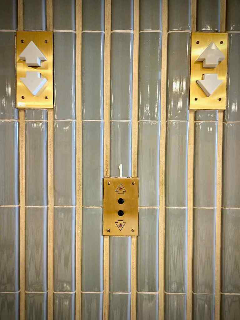 Touring the building, there’s so many fantastic things to see, showing how much thought went into every detail, no matter how little, both inside and out. It still has many original features, like the wonderful leather door handles and handrails, light fixtures and furniture, the lovely undulating tiles in different colours, the unusual heating panels on the canteen ceiling and the paternoster lift, which wasn’t running, unfortunately.