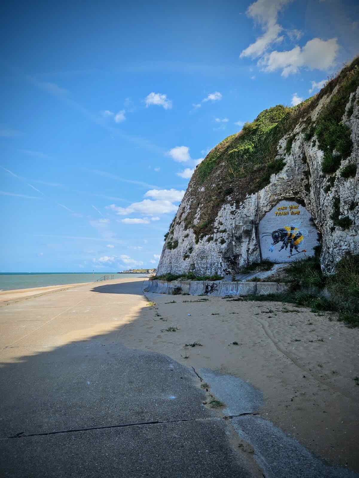 Setting off eastwards from Margate, the trail started as a concrete path along the seafront next to the beach and below the cliffs. Along here, there were some old buildings with street art and a small beach.