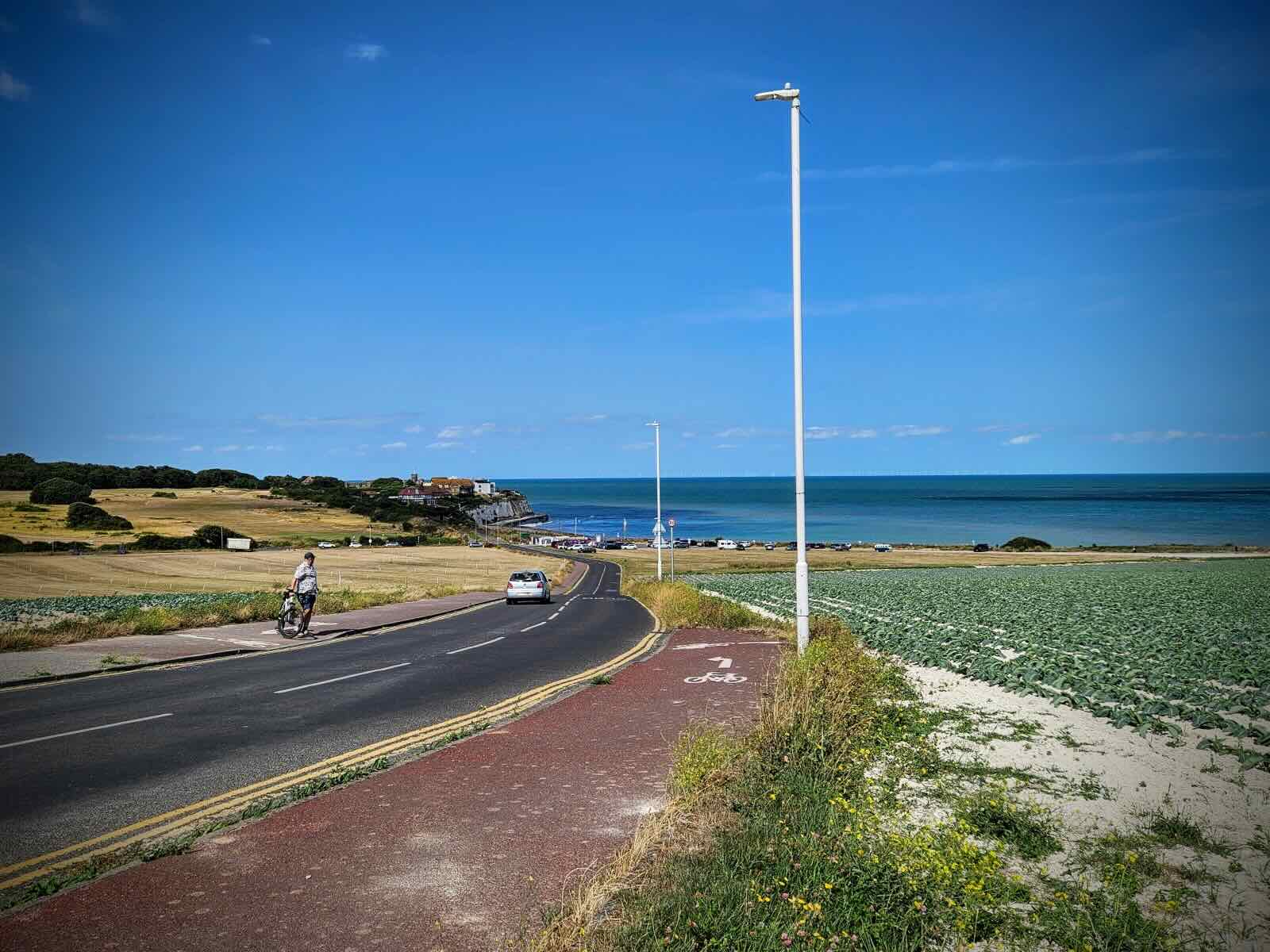 Leaving Ramsgate, we cycled along Westcliff Promenade, following the trail a little further, now on dedicated cycle lanes. Before we reached the end, we turned off the trail and headed inland, to continue on the Komoot route we were following.