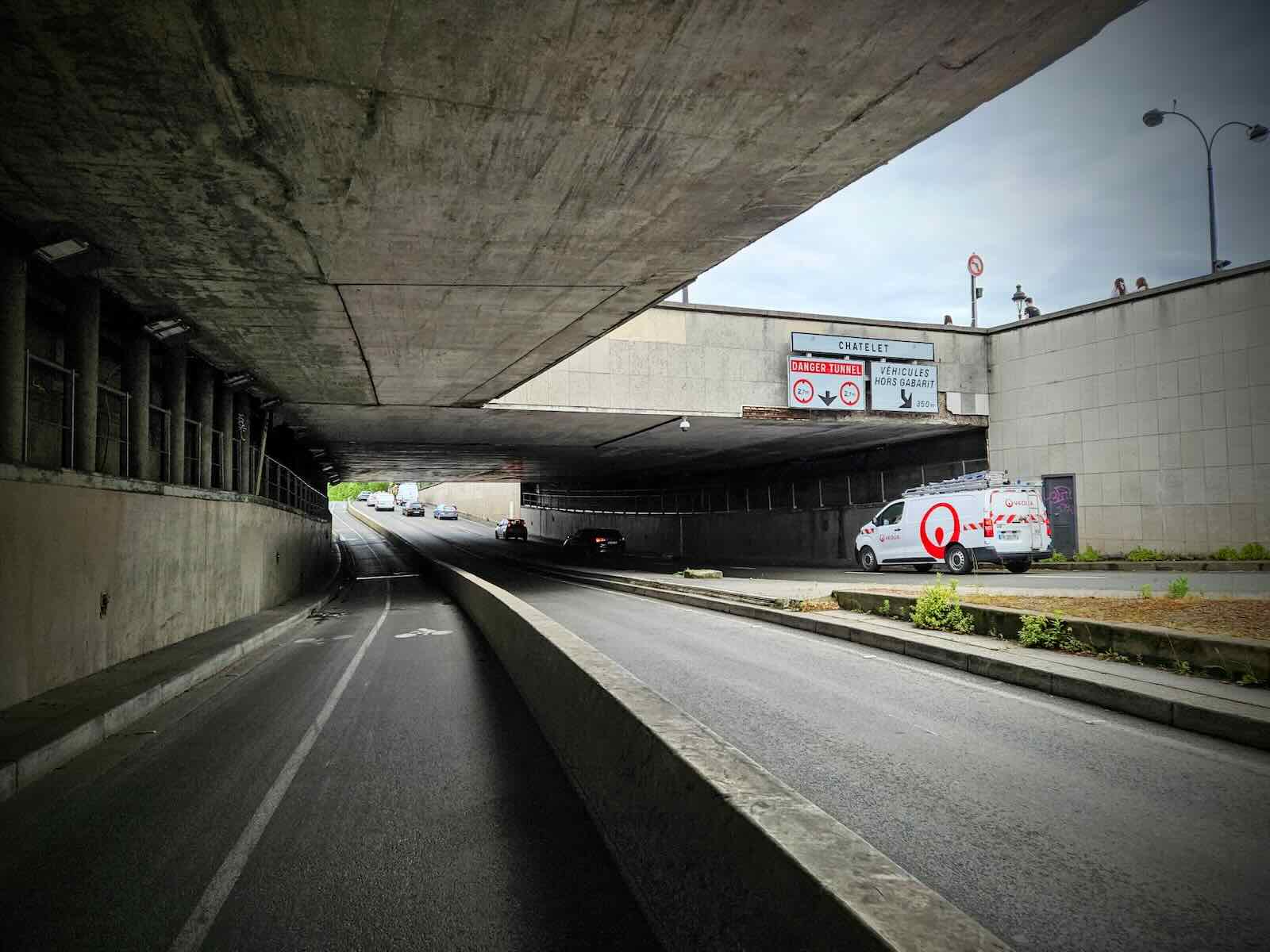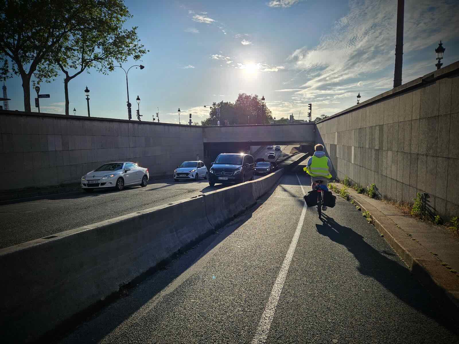 As I navigated Place de la Concorde, there were sections of temporary cycle lanes, I think as part of the preparations for the Olympics. This led on to the Quai des Tuileries tunnel, on a bidirectional cycle lane with a large concrete partition, protecting cycles from a fast moving traffic.