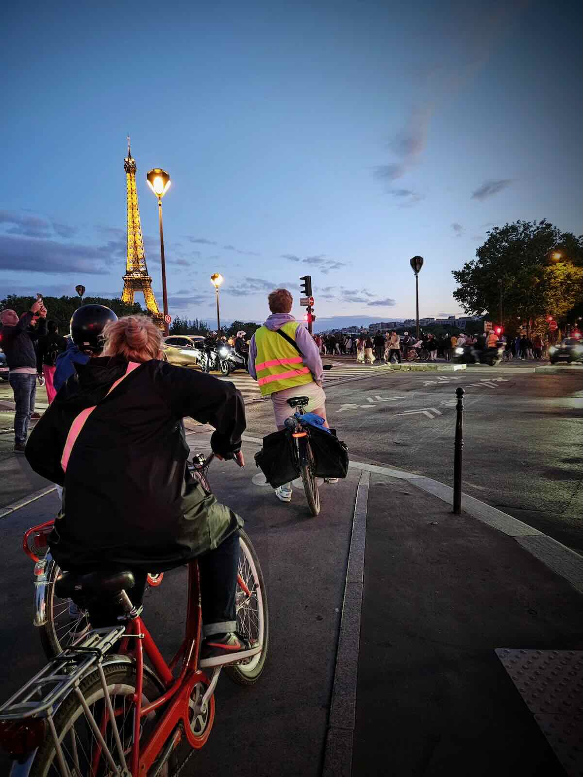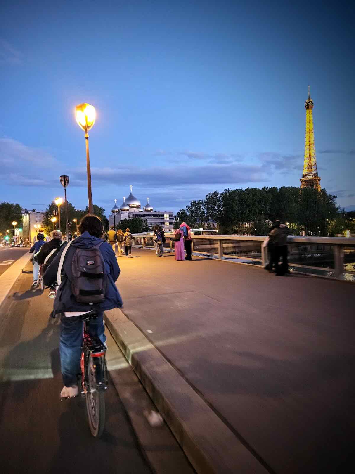 Now back on our bikes, it was time to continue what remained of the bike tour in the dark, making our way back to the beginning. This took us across Pont de l’Alma, before stopping at the Eiffel Tower, then onto Fat Tire Tours HQ.