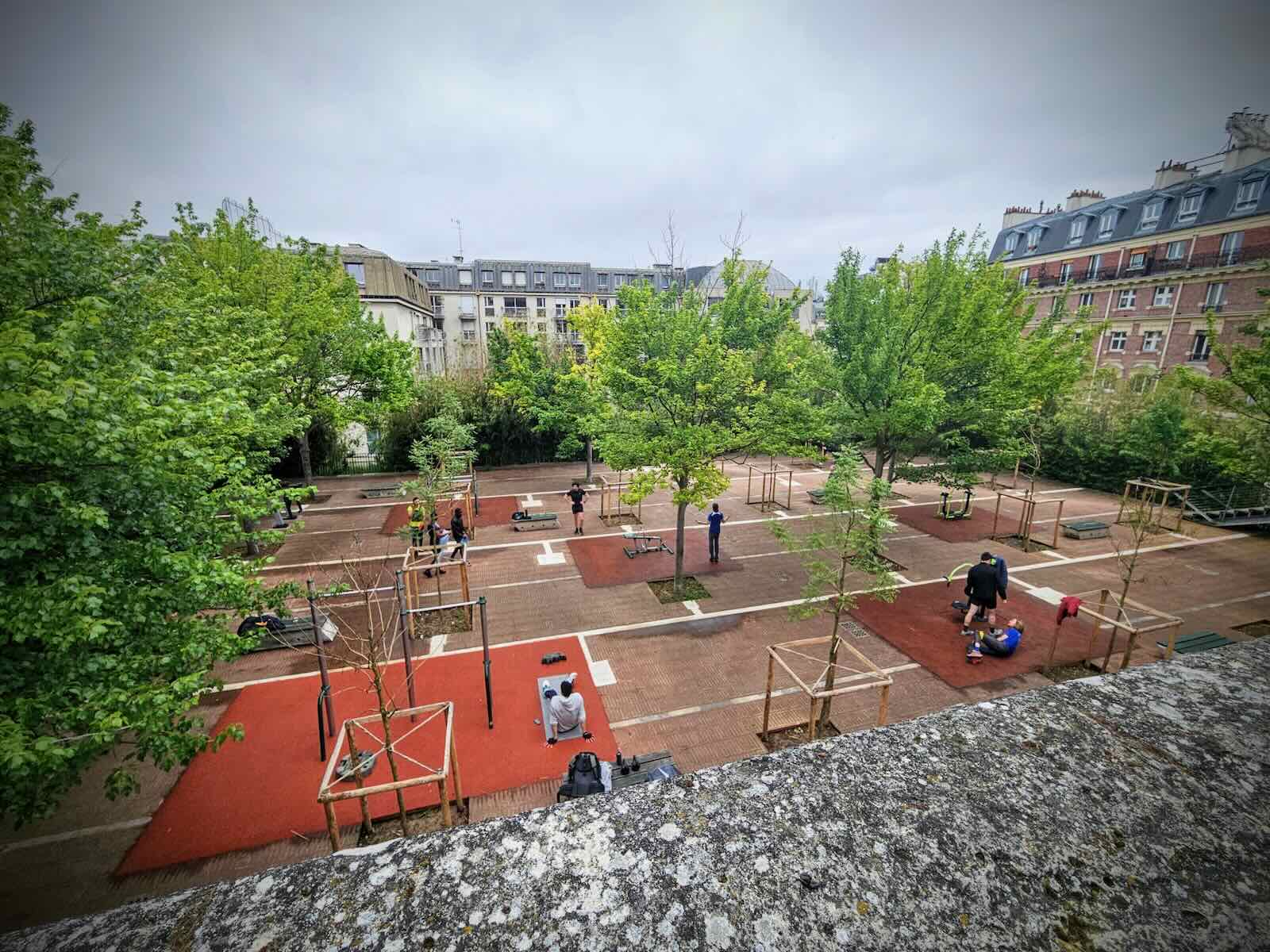 Further along, we passed some interesting seating, featuring artworks, a small park Jardin Hector Malot, containing lots of exercise equipment and new buildings built up to the viaduct.