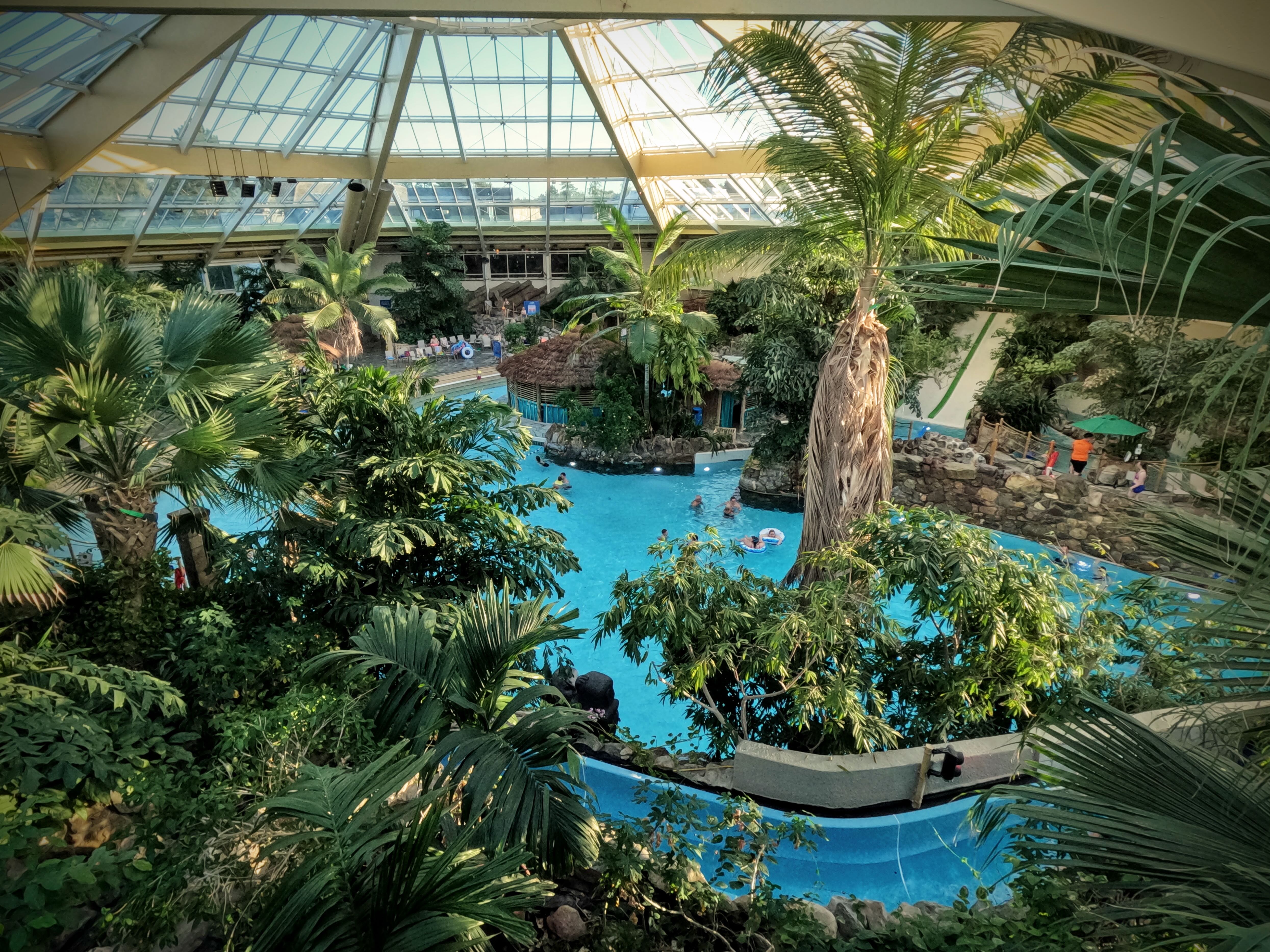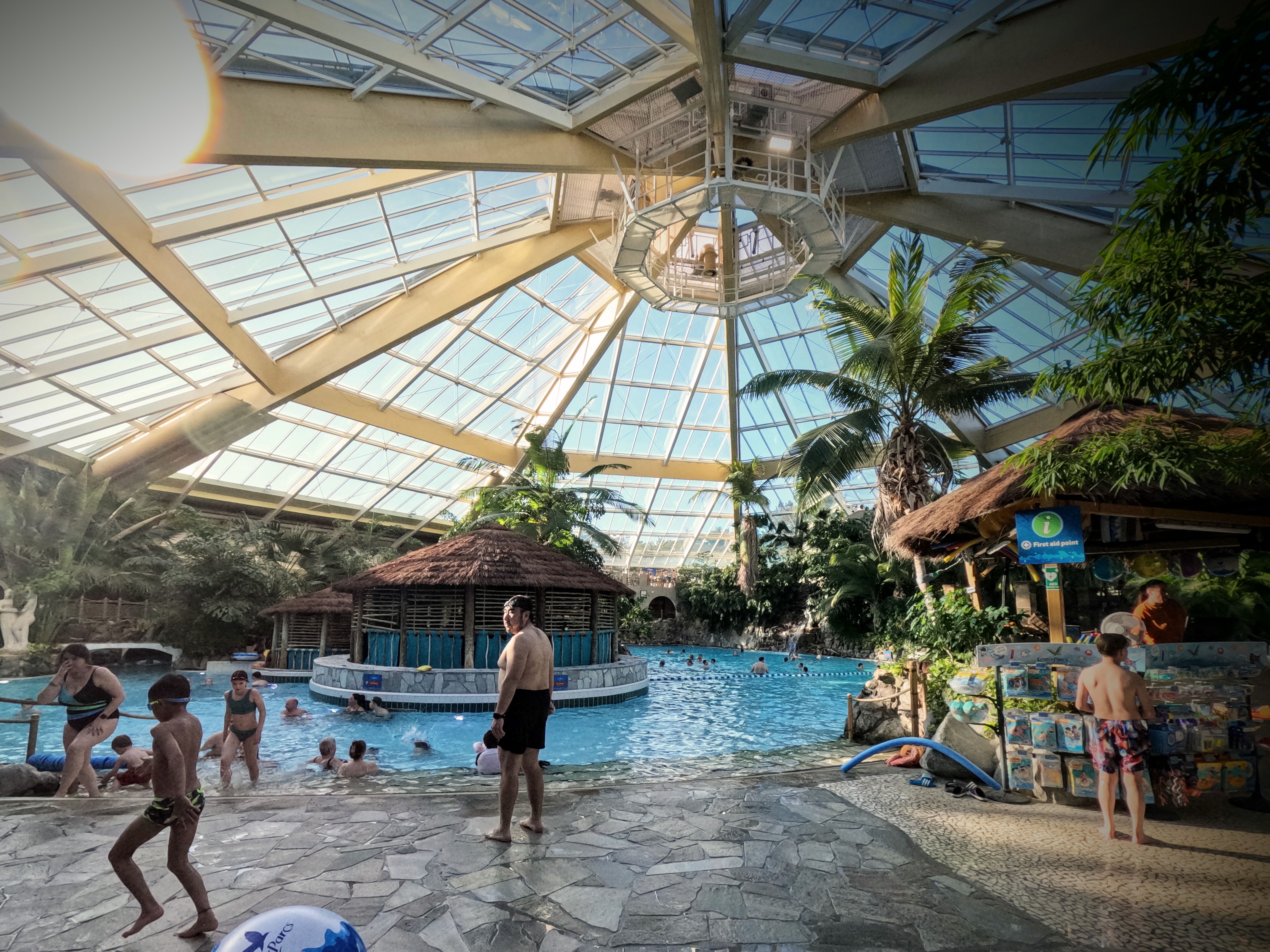 Arriving around 11am, we took the bikes off the car and headed onto the site. With a few hours to spare before we could get into the lodge, we headed to the pool at the Subtropical Swimming Paradise, to check out what was there.